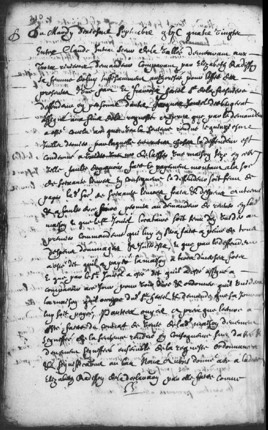 - Le titre complet de la pièce se lit comme suit : Requête de Claude Jutrat (Jutras), sieur de la Vallée (Lavallée), demeurant aux Trois-Rivières, demandeur comparant par sa femme Elisabeth Radisson, contre François Hertel, sieur de Lafresnière, et Jacques Jouiel (Joyal - Joyel) dit Bergerat (Bergerac) assigné aux fins de la requête, sur une sentence du 15 juillet 1680 où le défendeur est condamné de laisser une maison sise à Trois-Rivières faute de n'avoir fait paiement de 60 livres, que le demandeur est permis d'entrer en ladite maison et que le sieur Jouiel soit tenu de la vider au premier commandement à peine de tous dépens, dommages et intérêts; défendeur dit avoir payé en 3 diverses fois, ledit Bergerat a été assigné pour voir dire et ordonner de vider la maison qu'il occupe dudit Hertel et demande que sa journée soit payée; après déclaration faite du ladite Elisabeth Radisson de n'avoir été payé, ordonné le demandeur de prendre [...]