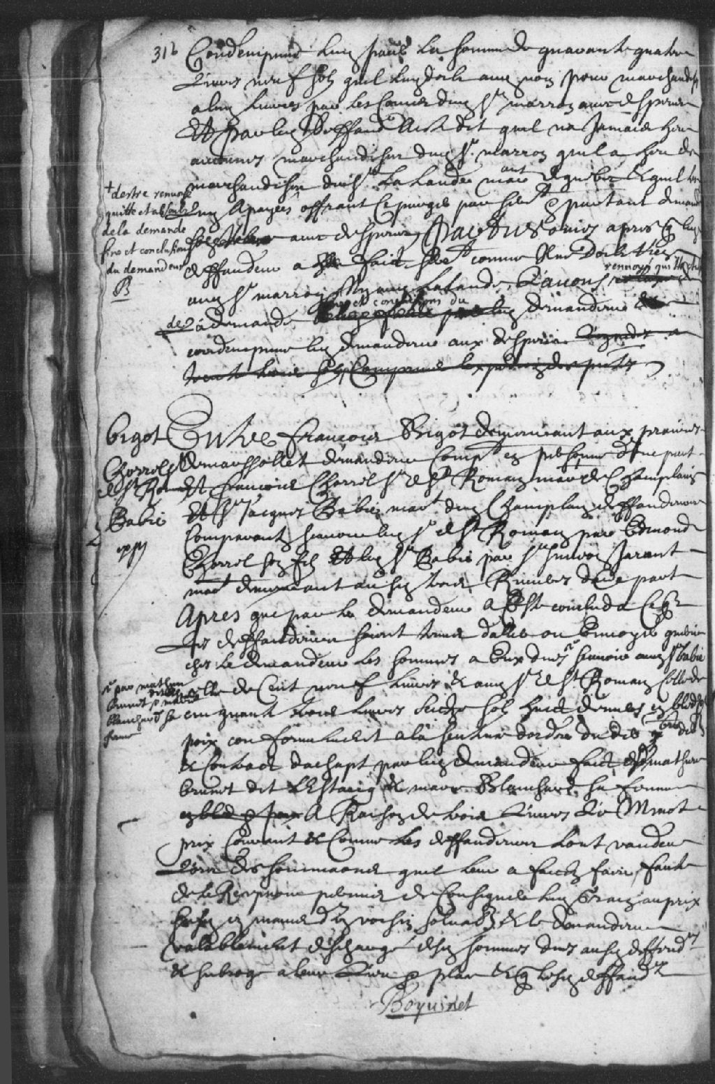 - Le titre complet de la pièce se lit comme suit : Requête de François Bigot demeurant aux prairies de Marsolet, demandeur, contre François Chorrel (Chorel), sieur de Saint-Romain et marchand de Champlain, demandeur comparant par Edmond Chorrel, son fils, et Jacques Babie, marchand dudit Champlain, autre demandeur comparant par Simon Jarant (Jarent), marchand demeurant aux Trois-Rivières, pour que les défendeurs soient tenus d¿aller ou envoyer quérir chez le demandeur les sommes à eux dues par Martin Brunet dit Lestang (Létang) et Marie Blanchard, sa femme, celle audit sieur Babie de 109 livres et celle audit sieur Saint-Romain de 53 livres 16 sols 8 deniers en blé et pois, qu¿ils prendront chez un voisin solvable; ledit défendeur Chorrel répond que comme c¿est la moisson est ouverte que le minot vaut moins et qu¿il doit être payé en argent monnaie à sa maison de Champlain, et ledit Jarant demande délai pour joindre ledit Babie qui est à Mont Royal ou sa femme à Québec; ordonné de produire dans huitaine tous les actes et obligations pour être prononcer en définitive; dépens réservés.