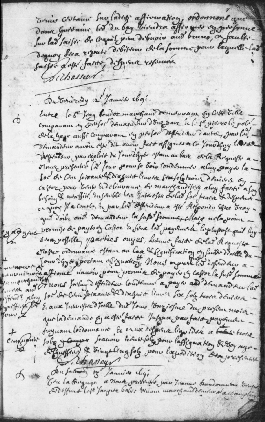 - Le titre complet de la pièce se lit comme suit : Saisie faite par Jeanne Dandonneau, veuve du défunt Jacques Babie (Baby), vivant marchand de Champlain, en son nom et en celui des enfants mineurs dudit défunt, demanderesse, à l'encontre de Jean Pépin dit Du Cardonnet (Descardonnets, Decardonnet), défendeur. La demanderesse réclame la somme de 460 livres, avec les intérêts, à laquelle le défendeur a été condamné en vertu d'une sentence rendue à Champlain. Ladite Dandonneau a aussi fait procéder par voie de saisie réelle sur une maison, grange, étable et terre situées sur la seigneurie de Cressé et elle réclame que, faute de paiement de ladite somme, la saisie soit déclarée bonne et valable et que la maison et ses dépendances soient vendues et adjugées. Il est déclaré que la saisie est bonne et valable et que, faute de paiement de la somme de 460 livres, la maison et ses dépendances peuvent être vendues et adjugées au plus offrant et [...]