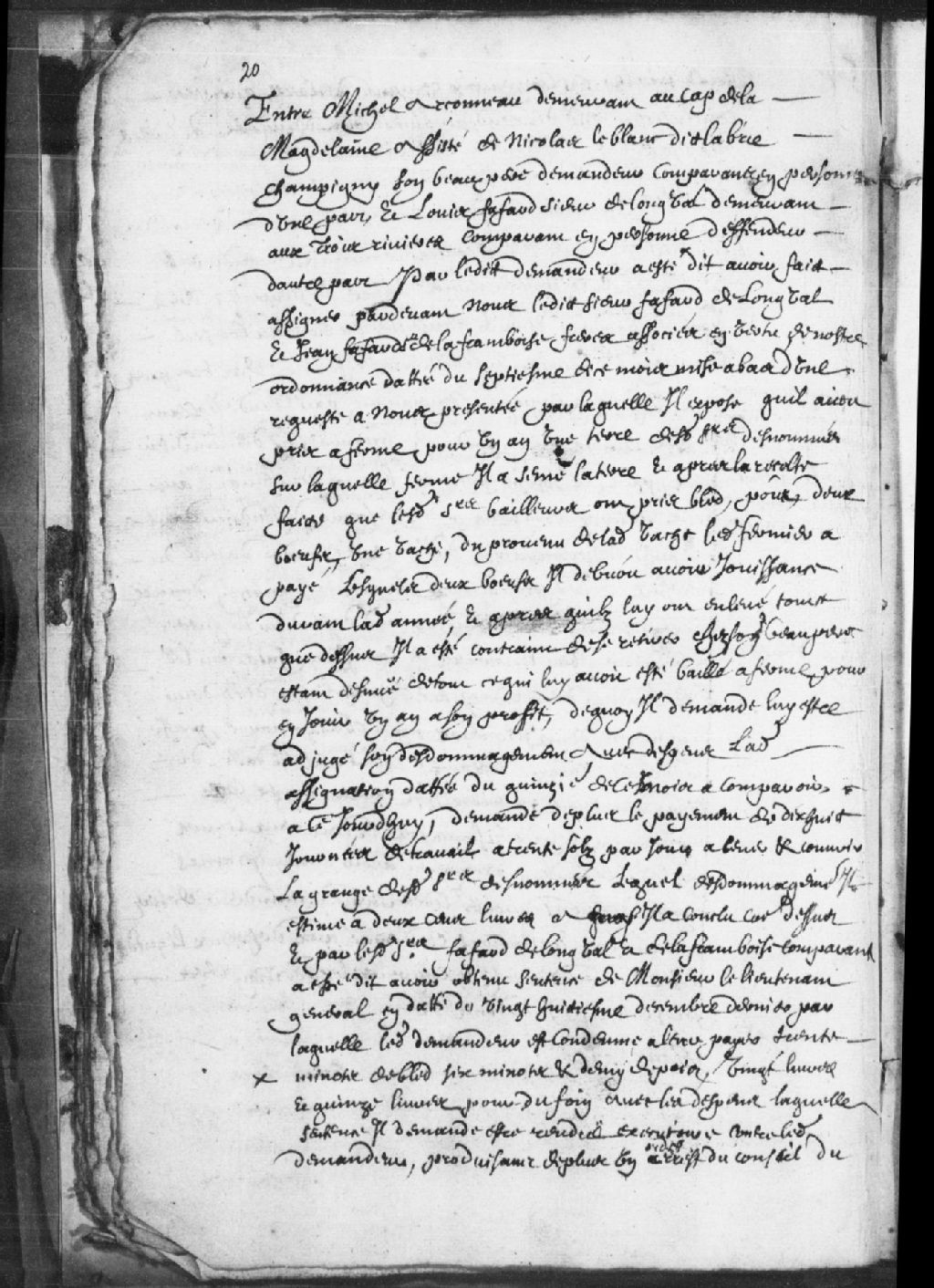 - Le titre complet de la pièce se lit comme suit : Requête de Michel Arseneau (Arsenault), demeurant au Cap-de-la-Madeleine, assisté de Nicolas Leblanc dit Labrie, son beau-père, demandeur, à l'encontre de Louis Fafard, sieur de Longval, demeurant à Trois-Rivières et Jean Fafard de la Framboise (Laframboise), défendeurs. Le demandeur réclame des dédommagements pour une terre qu'il avait prise à ferme, pour un an, pour en jouir à son profit et qu'il avait semée mais qu'après la récolte faite, les sieurs défendeurs ont pris le blé, les pois, 2 boeufs et une vache et il a ainsi été obligé de se retirer chez son beau-père n'ayant plus rien. Ledit Arseneau réclame également le paiement de 18 journées de travail à 30 sols par jour pour des travaux faits sur la grange desdits défendeurs, lequel dédommagement il estime à environ 200 livres. Le sieur de Longval réplique qu'il a obtenu sentence de monsieur le lieutenant-général contre le demandeur, [...]