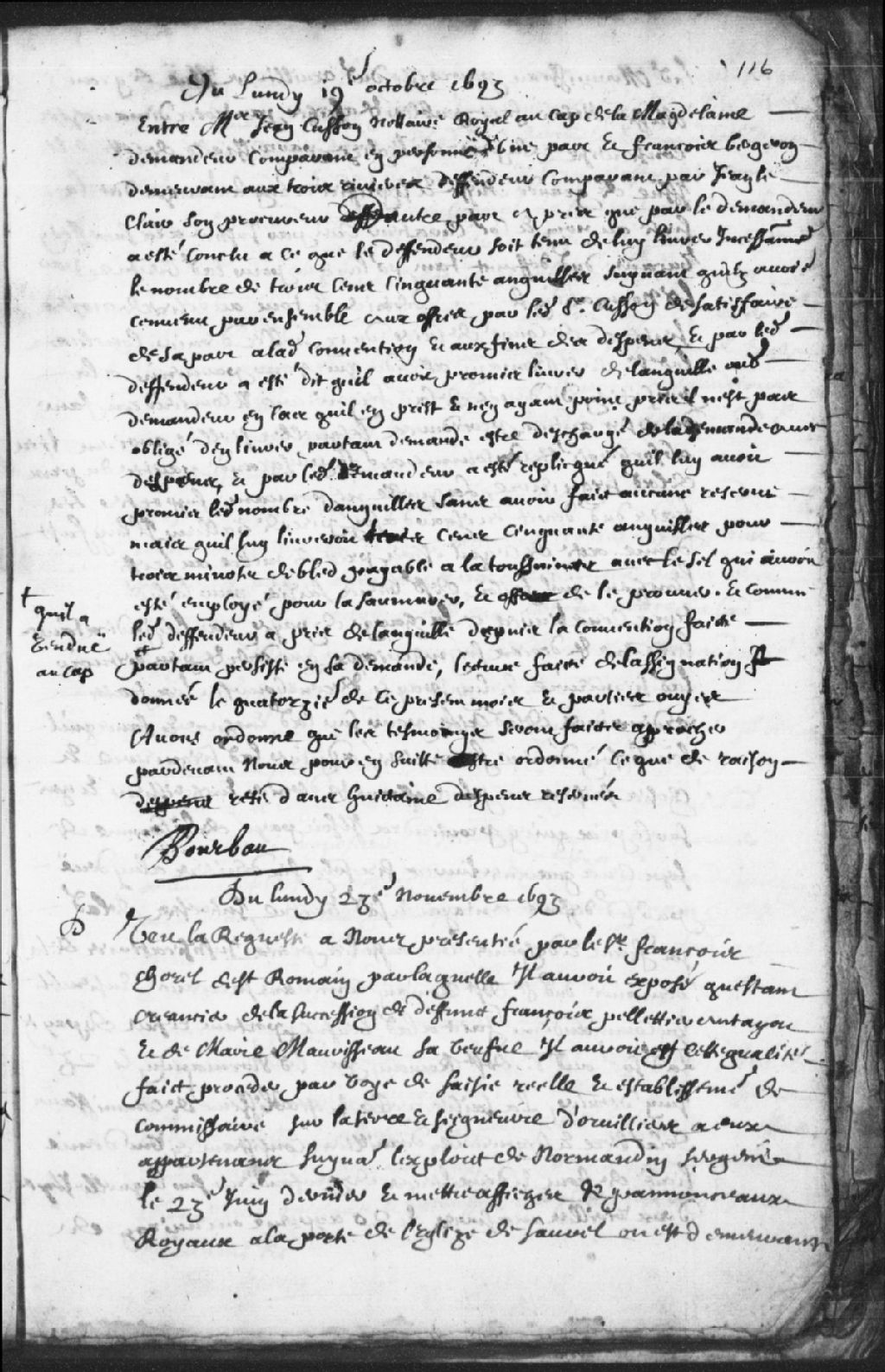 - Le titre complet de la pièce se lit comme suit : Instance de François Chorel de Saint-Romain qui, en tant que créancier de la succession du défunt François Pellettier (Pelletier) Antaya et de Marie Maurisseau (Morisseau), sa veuve, a fait procéder par voie de saisie réelle sur la terre et la seigneurie de Dorvilliers, ce qui a été affiché pour 3 dimanches consécutifs sur la porte de l'église de Sorel à l'issue de la grande messe, le tout signifié à Guy Vacher dit Laserte (Lacerte), curateur créé par justice à la succession vacante dudit défunt. Les biens saisis seront adjugés au plus offrant et ledit sieur de Saint-Romain sera payé la somme de 740 livres, 6 sols et 6 deniers sur la vente, laquelle somme qui lui est due par le défunt Antaya et sa veuve.