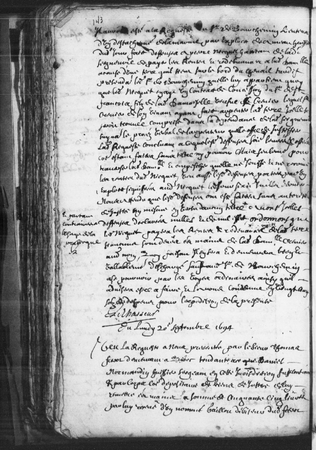 Requête de Thomas Frérot, demeurant à Québec, pour que Daniel Normandin, huissier de la Juridiction de Trois-Rivières, lui remette en mains la somme de 55 livres par lui reçue par un nommé Gaillou (Gailloux), son débiteur. Ledit Normandin est condamné à verser la somme de 55 livres au demandeur, 20 septembre 1694, Archives nationales à Trois-Rivières, Fonds Juridiction royale des Trois-Rivières, (04T,TL3,S11,P2409).