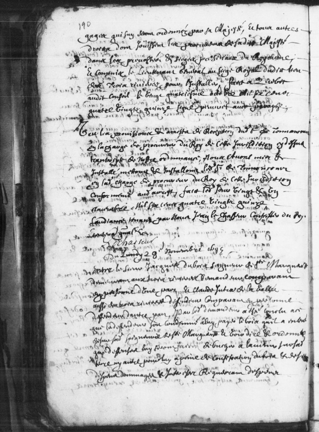 Confirmation de la nomination de René de Godefroy de Tonnancour qui est installé en la charge de conseiller et de procureur du Roi en la Juridiction de Trois-Rivières, par Jean Lechasseur, conseiller du Roi et lieutenant-général, 21 novembre 1695, Archives nationales à Trois-Rivières, Fonds Juridiction royale des Trois-Rivières, (04T,TL3,S11,P2451).