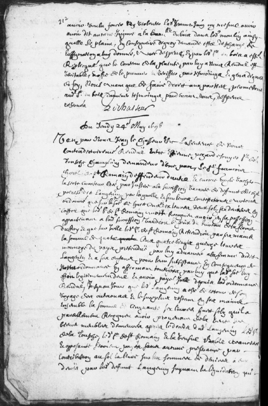 - Le titre complet de la pièce se lit comme suit : Instance entre Étienne Pézard (Pésard), écuyer, sieur de la Tousche (Latouche) et de Champlain, demandeur, à l'encontre de François Chorel de Saint-Romain, défendeur, ainsi que Guy Vacher Laserte (Lacerte), curateur créé par justice à la succession vacante du défunt Michel Poirier dit Langevin, défendeur d'autre part. Il avait été décidé que le sieur de la Tousche, le sieur de Saint-Romain et la veuve Babie (Baby), créanciers du défunt Langevin, seraient payés sans aucune préférence sur les sommes qui leur sont dues par ledit défunt. Il est ordonné que ledit demandeur soit payé 100 livres et 8 deniers sur sa créance, que le sieur de Saint-Romain soit payé 428 livres, 6 sols et 8 deniers sur sa créance et 21 livres, 12 sols et 7 deniers à la veuve Babie pour sa propre créance.