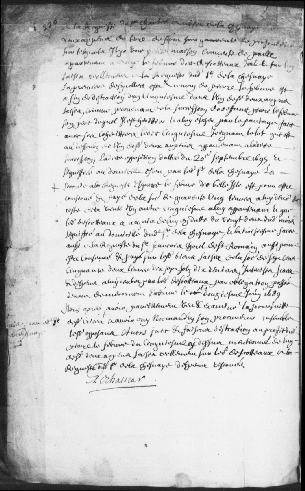 Déclaration de Jean Lechasseur à la suite des oppositions à propos du décret poursuivi par Charles Auber (Aubert) de la Chesnaye (LaChesnaye) sur la saisie réelle d'une terre appartenant à Ange Lefebvre dit Descotteaux (Descôteaux)..., 9 juillet 1696, Archives nationales à Trois-Rivières, Fonds Juridiction royale des Trois-Rivières, (04T,TL3,S11,P2478).
