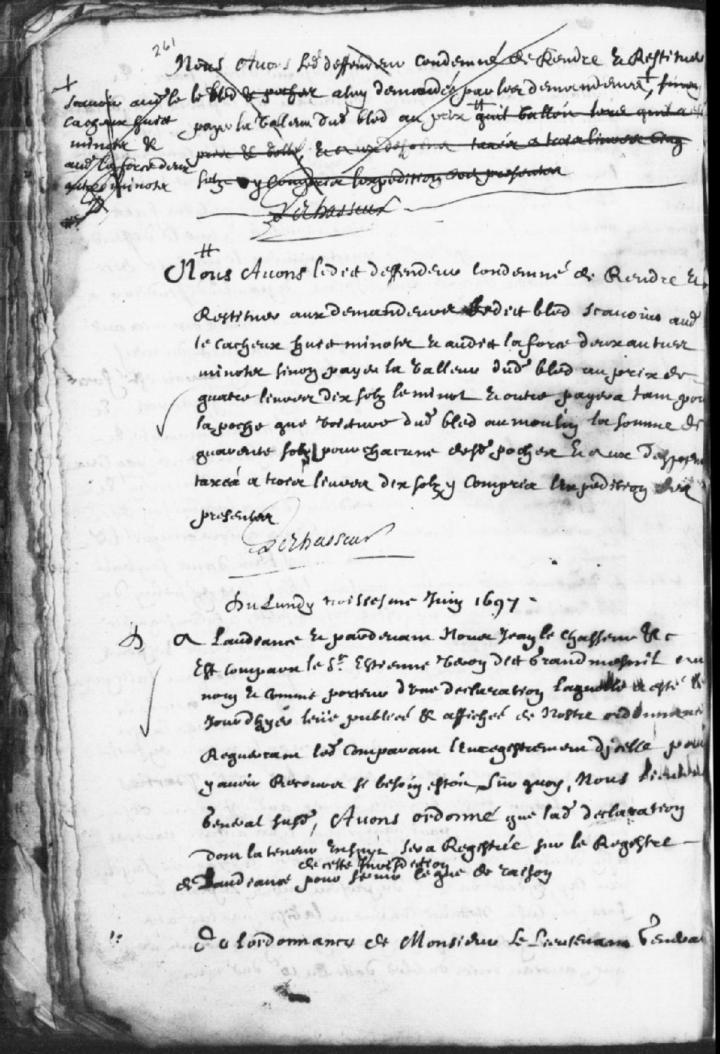 - Le titre complet de la pièce se lit comme suit : Ordonnance de monsieur le lieutenant-général. Il appartiendra aux Pères Jésuites, que bien que les fermiers et rentiers qu¿il ont eu sur leur terres, tant dans l¿enceinte de Trois-Rivières qu¿au bas du Côteau, au lieu que l¿on appelle maintenant la Basse Ville, ayant tout à fait négligé de soutenir et de faire payer des droits et redevances dus audits Pères, et quoi qu¿ils ne puissent avoir aucune prescription contre le bien de l¿Église, dans la perspective où lesdites terres et emplacements retourneraient aux Pères, ces derniers font savoir à tous les prétendus intéressés qu¿ils désapprouvent absolument de toute la négligence et le manque de soins desdits fermiers et rentiers, protestant contre tout ce qu¿ils ont laissé faire au préjudice de leurs droits, et prétendent se relever de tout ce qui aura été fait à l¿encontre de leur volonté, dans le cas où ils entrent en possession de leur terres. Fait aux Trois-Rivières, en date du 29 mai 1697. Soussigné François Vaillant, procureur des Pères Jésuites au Canada.