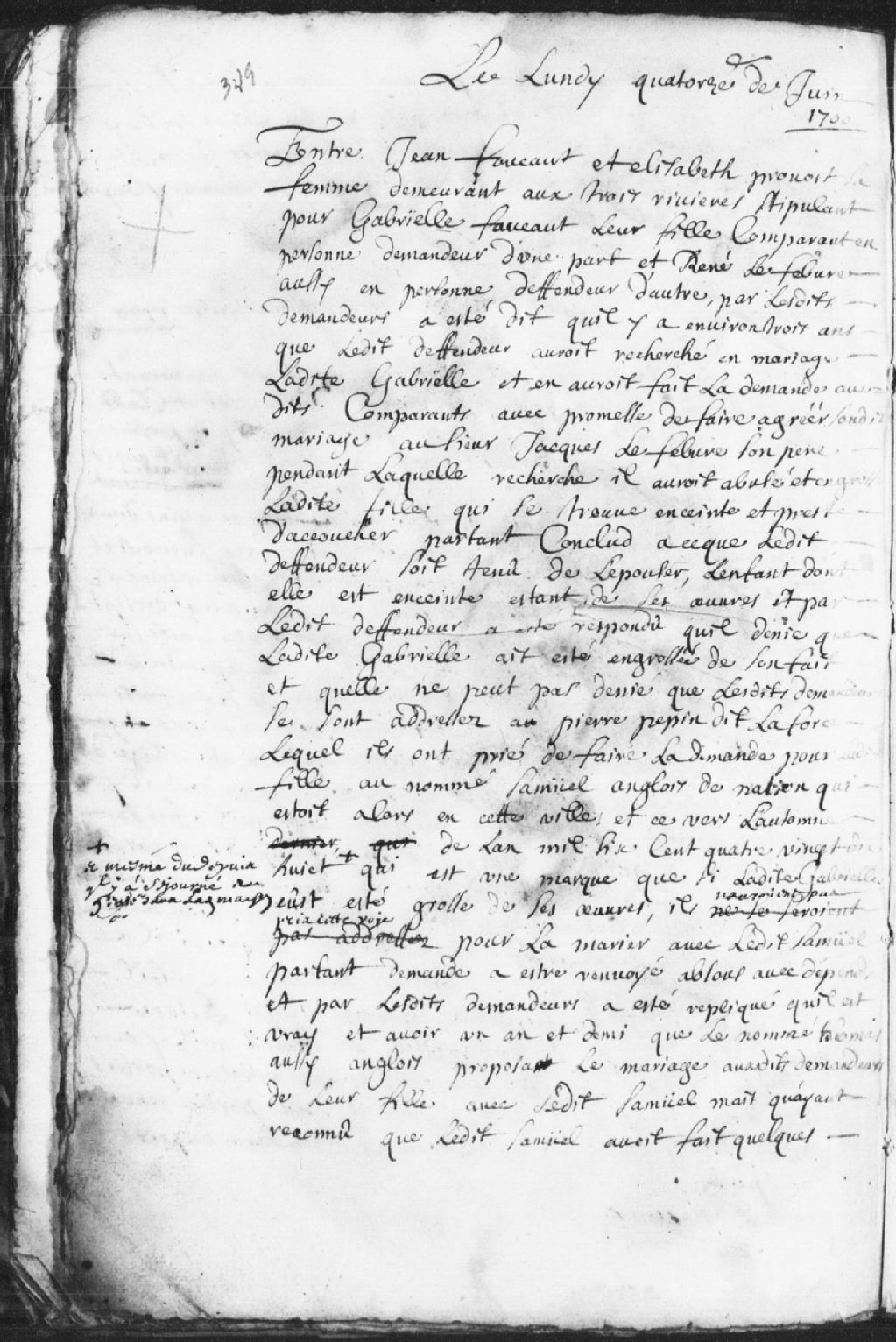 Le titre complet de la pièce se lit comme suit : Requête de Jean Foucaut (Foucault) et Élisabeth Prévost, sa femme, demeurant aux Trois-Rivières, stipulant pour Gabrielle Foucault, comparant en personne, demandeur d¿une part, à l¿encontre de René Lefebvre, comparant en personne, défendeur d¿autre part. Les demandeurs ont dit qu¿il y a trois ans que le défendeur a recherché en mariage ladite Gabrielle et en a fait la demande audits demandeurs avec promesse de faire agréer son mariage par Jacques Lefebvre, son père. Durant cette période, il aurait abusé et engrossé ladite fille qui se trouve enceinte et prête à accoucher. Le demandeur conclu que ce faisant le défendeur est tenu d¿épouser ladite Gabrielle. Le défendeur a répondu qu¿il nie avoir engrossé ladite Gabrielle de son fait et qu¿elle ne peut pas nier que lesdits demandeurs se sont adressés à Pierre Pépin, dit Laforce, lequel il ont prié de faire la demande pour ladite fille, au nommé Samuel, anglais de nation, qui était alors en cette ville vers l¿automne de l¿an 1698, et même qu¿il a séjourné dans ladite maison, ce qui est une marque que si ladite Gabrielle aurait été grosse de ses oeuvres il n¿aurait pas pris cette voie pour la marier avec ledit Samuel. Les demandeurs ont répliqué qu¿il est vrai qu¿il y a un an et demi, le nommé Thomas, aussi anglais, proposa d¿épouser ladite Gabrielle, tout comme Samuel, mais qu¿ayant reconnu que ledit Samuel avait fait quelques friponneries, ils refusèrent la demande. Les demandeurs considèrent l¿argument du défendeur irrécevable, d¿autant plus qu¿il a offert une bague, un fichu et une ceinture de soie à ladite Gabrielle, sous promesse de mariage, et qu¿il y a un an ou environ qu¿il loge chez le demandeur. Lecture faite de la requête, il est autorisé que les demandeurs amènent des témoins devant cette cour pour attester de la fréquentation de Gabrielle et du défendeur.