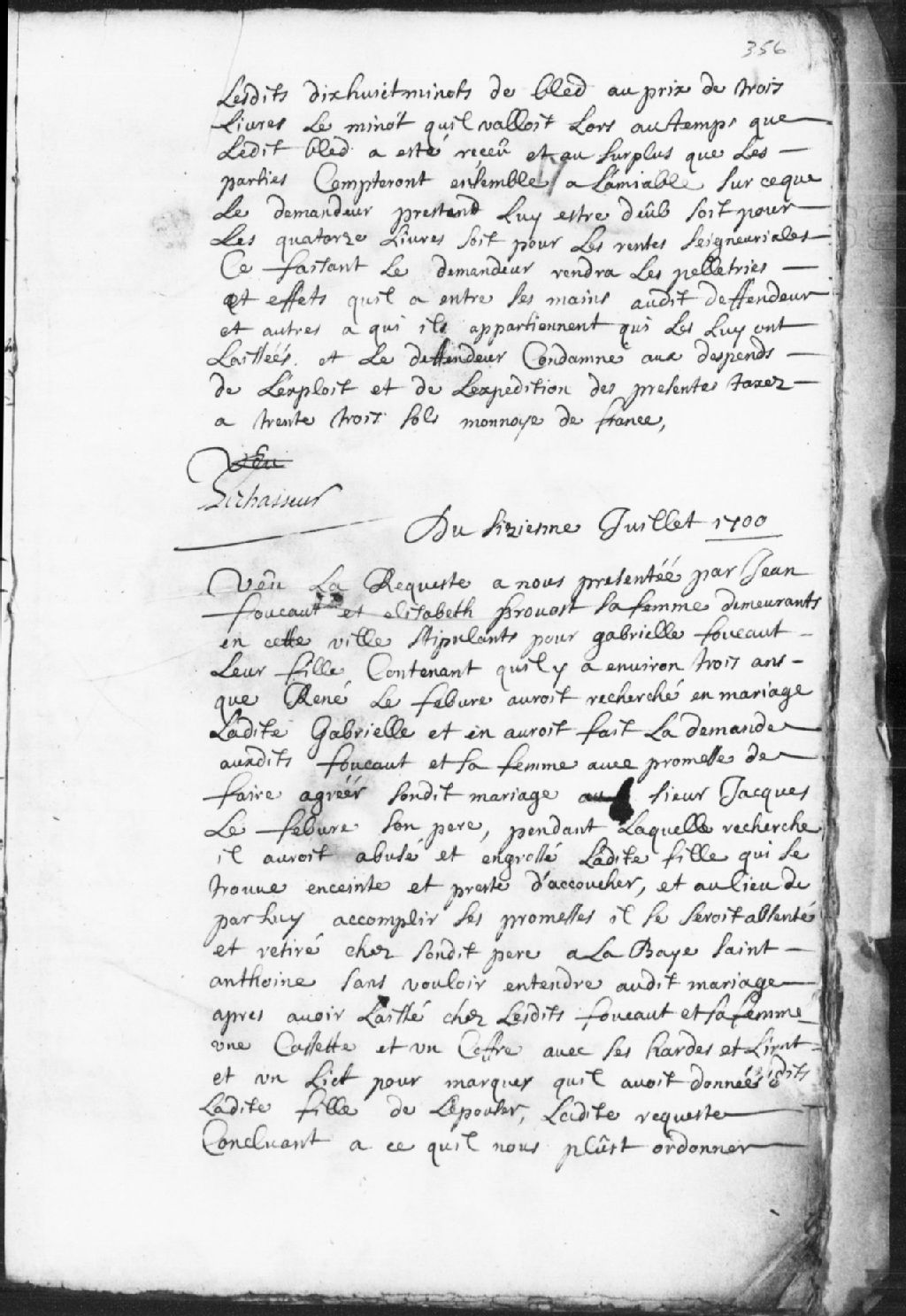 - Le titre complet de la pièce se lit comme suit : Requête de Jean Foucault et Élizabeth Prévost, sa femme, demeurant en cette ville, stipulant pour Gabrielle Foucault, leur fille, demandeurs d¿une part, à l¿encontre de René Lefebvre, défendeur d¿autre part. Les demandeurs ont dit qu¿il y a trois ans que le défendeur a recherché en mariage ladite Gabrielle et en a fait la demande audits demandeurs avec promesse de faire agréer son mariage par Jacques Lefebvre, son père. Durant cette période, il aurait abusé et engrossé ladite fille qui se trouve enceinte et prête à accoucher. Au lieu d¿accomplir les promesses qu¿il a faites, il s¿est retiré chez son père, à la Baie-Saint-Antoine, après avoir laissé chez les demandeurs une cassette et un coffre avec ses hardes et linges. Après interrogation du défendeur, contenant les confessions et dénégations faites en la demeure d¿Ignace Lefevbre, et qu¿il est reconnu que l¿enfant que porte ladite Gabrielle provient de leur oeuvre, la cour condamne ledit René Lefebvre à épouser ladite Gabrielle Foucault en face de l¿église dans une quinzaine et il est ordonné qu¿il nourrisse, entretienne et élève l¿enfant qui est le sien dans la foi catholique apostolique et romaine, et ce, jusqu¿à ce que l¿enfant est en âge de raison. En outre, ledit Lefebvre est condamné à verser 500 livres à ladite Gabrielle pour dommages et intérêts, et condamné aux dépens taxés à 19 livres et 13 sols, monnaie de France.