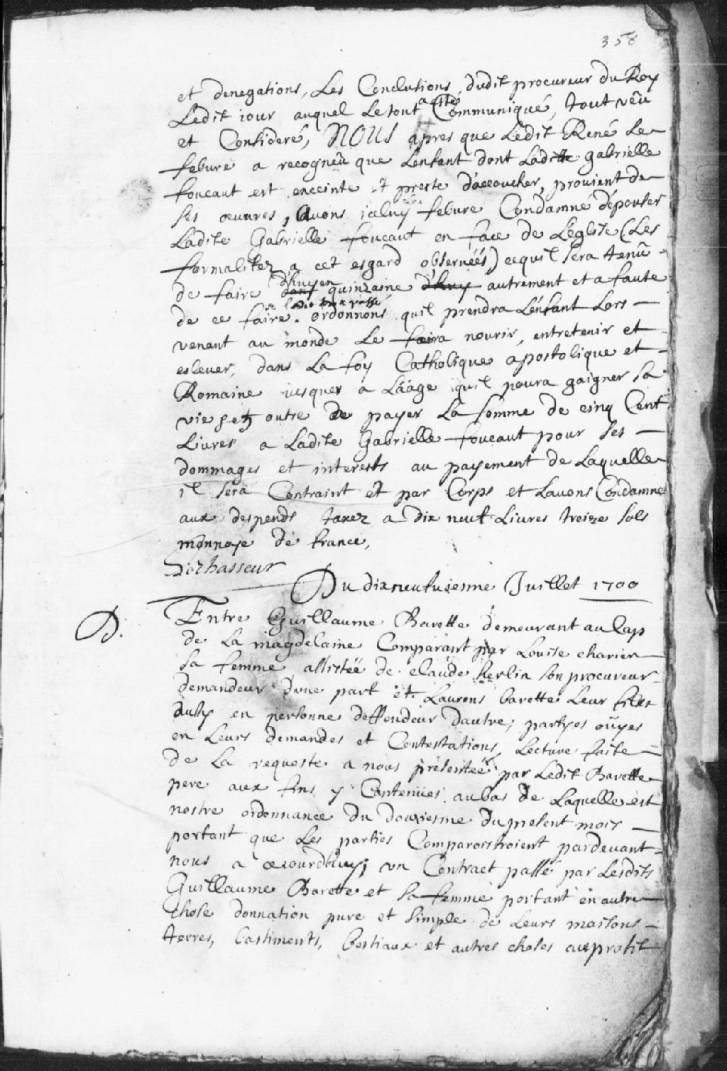 - Le titre complet de la pièce se lit comme suit : Requête de Guillaume Barette, demeurant au Cap-de-la-Madeleine, comparant par Louise Charrier, sa femme, aidé de Claude Herlin, son procureur, demandeur d¿une part, à l¿encontre de Laurent Barette, leur fils, comparant en personne, défendeur d¿autre part. Lecture faite de la requête présentée par ledit Barette père, d¿un contrat passé entre Guillaume Barette et sa femme, concernant la donation pure et simple de leurs maison, terre, bâtiments et bestiaux et autres choses, au profit de leur fils Laurent Barette et sa femme, aux charges et clauses portées devant Cusson, notaire, le 20 juin 1699. Après que les parties se sont désistés et départis dudit contrat de donation, la cour a déclaré ledit contrat nul. Il est ordonné que ledit Barette, fils, rende à son père 2 boeufs, une vache, une charrue, une charrette, 3 tarières, un bassin d¿étain, un croc de fer, une houe, une fourche et une faux, qui lui ont été baillé lors de ladite donation. Ledit Barette, père, est condamné à payer à son fils, la somme de 51 livres pour avoir aidé à battre 160 minots de blé et 15 minots d¿avoine. En outre, que la récolte de grain à faire cette année soit divisée entre eux sur le champ; que les parties récoltent les pois que chacun d¿eux a respectivement semé et que les foins appartiendront à Barette, père. Enfin, ledit Barette, fils, et sa femme devront vider la maison avant le 8 octobre de cette année. Dépens compensés, taxés à 3 livres, monnaie de France et payés par moitié par les parties.