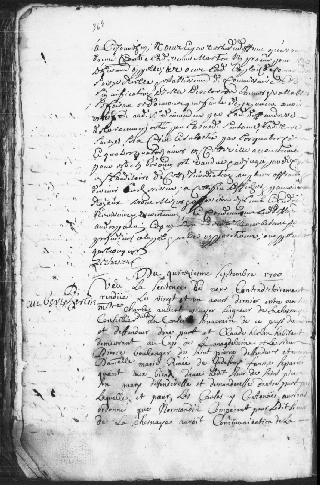 - Le titre complet de la pièce se lit comme suit : Requête de maître Charles Aubert, sieur de la Chesnaye (Lachesnaye), écuyer, conseiller du Roi au Conseil souverain de Québec, comparant par Daniel Normandin, son procureur, demandeur et défendeur d¿une part, à l¿encontre de Claude Herlin, habitant du Cap-de-la-Madeleine, et le sieur Pierre Boulanger de Saint-Pierre, défendeur, et encore demoiselle Marie-Renée de Godefroy, femme séparée quant aux biens avec ledit sieur de Saint-Pierre, son mari, défenderesse et demanderesse d¿autre part. À l¿égard de la sentence contradictoire rendue par cette cour, le 21 août dernier, par laquelle la cour avait ordonné que ledit Lachesnaye ait communication de la sentence de séparation et, quoique ladite Marie-Renée de Godefroy ait cru que sa demande était bien fondée, elle n¿empêchait point que la demande dudit la Chesnaye soit adjugée à la faveur de celui-ci. Obligation faite par le sieur Boulanger, [...]