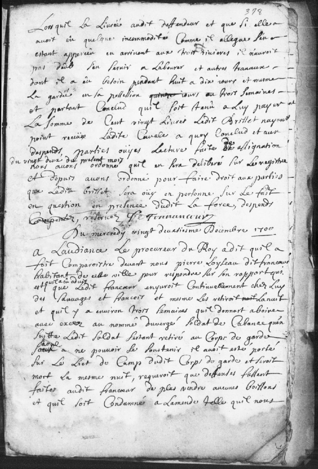 - Le titre complet de la pièce se lit comme suit : Comparution de Pierre Loiseau dit Francoeur, habitant de Trois-Rivières, à la demande du procureur du Roi. Sur le rapport du procureur, ledit Francoeur retient chez lui des Sauvages et des Français, et leur donne à boire. De même, il y a trois semaines, il donna à boire audit Duverger, soldat de Cabanac (Cabana). Ledit soldat s¿étant retiré au corps de garde, saoul à ne plus pouvoir se soutenir, fut étendu sur le lit de camp dudit corps de garde où il est mort pendant la nuit. Le procureur requiert qu¿il soit fait défense audit Francoeur de vendre ou de donner de la boisson à l'avenir. Il est ordonné que ledit Loiseau soit informé des faits ci-dessus. En outre, la cour lui défend de vendre de la boisson à l¿avenir.Ledit Francoeur a répondu que le jour avant la mort de Duverger, le nommé Lajeunesse, soldat de Cabanac, revenant de Gataroquouy, alla chez lui demander à boire et à manger, et il envoya quérir le nommé Lacaille, soldat de Cabanac, lesquels burent et mangèrent en compagnie dudit Duverger. Ledit Duverger s¿en alla, alors que ledit Lajeunesse et Lacaille dormirent chez lui. Le lendemain matin lesdits soldats retournèrent chez lui et burent trois demiards d¿eau-de-vie en ayant chacun donné un coup à boire aux nommés Crédit et Labare (Labarre) qui entrèrent dans la maison pour boire une roquille de vin, suite à quoi les soldats se retirèrent à deux heures, offrant de prouver qu¿ils n¿étaient point ivres. Après deux heures environ, ledit Lajeunesse et Labare retournèrent chez lui, mais ils ne burent et ne couchèrent point en sa maison. Quant à Duverger, ledit Loiseau affirme que celui-ci n¿a pas passé chez lui et d¿ailleurs qu¿il n¿y a pas bu. Ledit Loiseau déclare que Duverger était au corps de garde, et que s¿il s¿est enivré, il a peut-être acheté l¿eau-de-vie au sergent du corps de garde.
