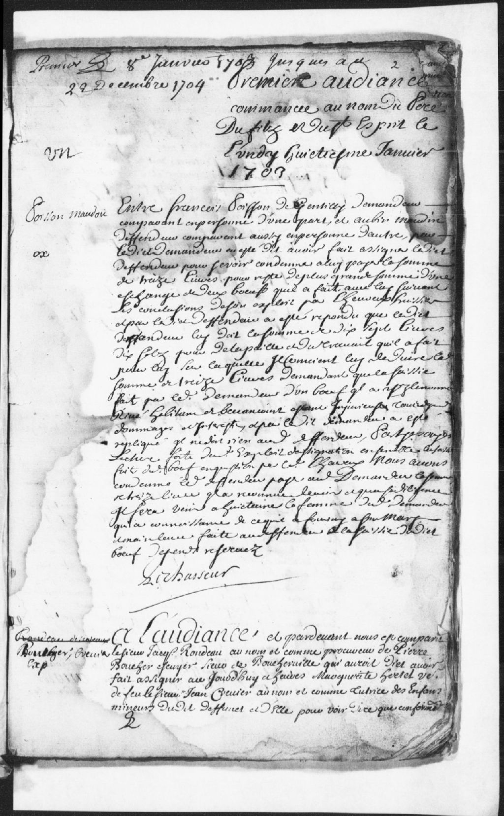 Requête de François Poisson de Gentilly, demandeur, contre Aubin Maudin (Maudou), défendeur..., 8 janvier 1703, Archives nationales à Trois-Rivières, Fonds Juridiction royale des Trois-Rivières, (04T,TL3,S11,P2603).