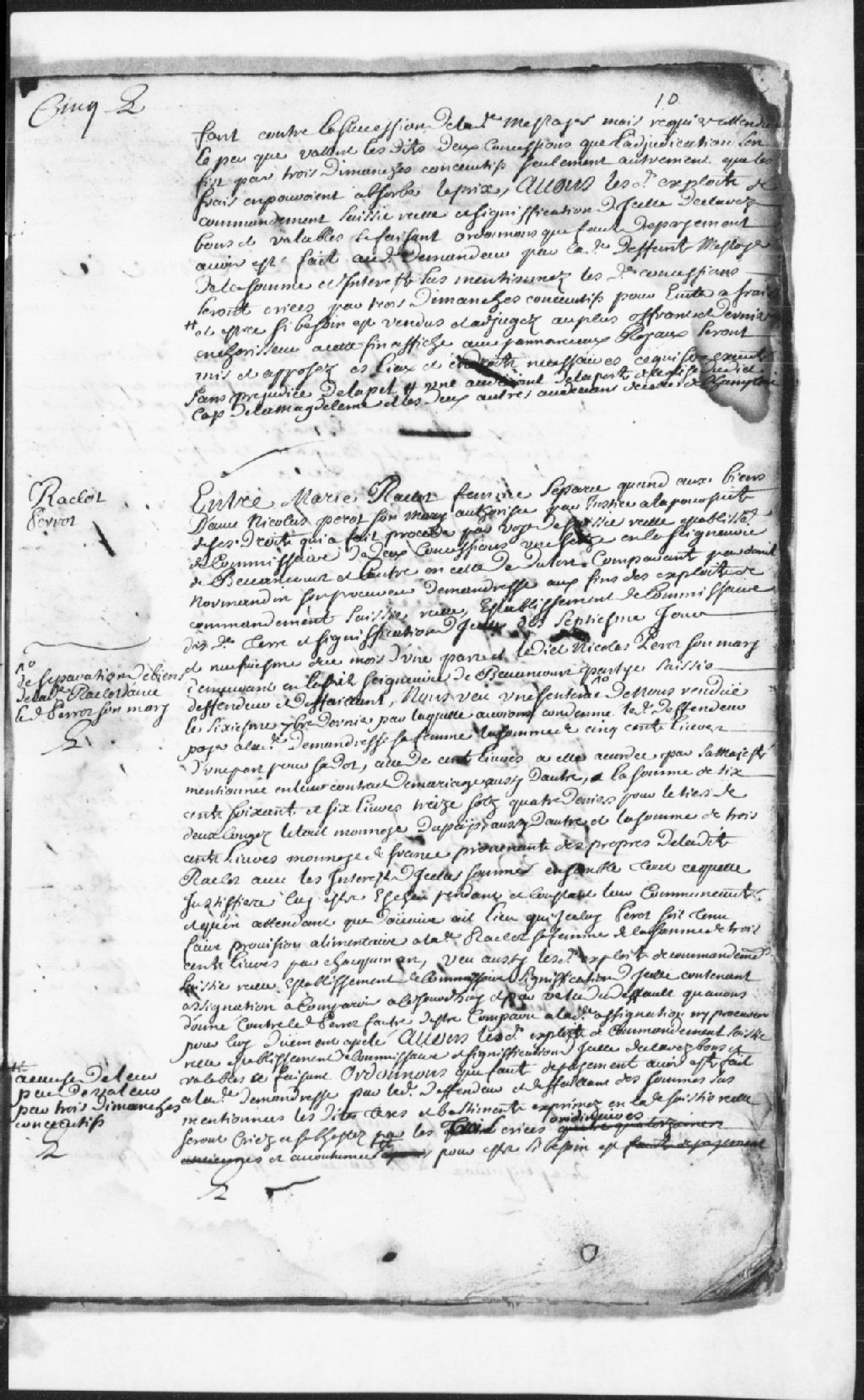 - Le titre complet de la pièce se lit comme suit : Défaut accordé à Marie Raclos, femme séparée de biens d¿avec Nicolas Perot (Perrault), autorisée par justice à la poursuite de ses droits, demanderesse, comparant par Daniel Normandin, contre ledit Nicolas Perot, son mari, demeurant en la seigneur de Bécancour, partie saisie, défendeur et défaillant, pour avoir fait, par voie de saisie réelle, établissement de commissaire de deux concessions aux fins des exploits de commandement de saisie réelle et établissement de commissaire des terres et pour qu¿ils soient reconnus bons et valables; il est ordonné que les terres et bâtiments seront, faute de paiement et exprimés en la saisie réelle, criés et subhastés par trois criées ordinaires pour la valeur des dus par trois dimanches consécutifs alors que le défendeur est condamné aux dépens.Exploits et commandement de saisie réelle de deux concessions, l¿une sise en la seigneurie de Bécancour et l¿autre en la seigneurie de Dutort et l¿établissement de commissaire est en date des 7 et 9 de ce mois. Pour mieux comprendre la cause, se référer à la pièce d¿une sentence de séparation de biens rendue le 6 septembre dernier où le défendeur est condamné à payer la somme de 500 livres pour la dot de sa femme, celle de 100 livres accordée par Sa Majesté en leur contrat de mariage, la somme de 666 livres, 13 sols et 4 deniers pour le tiers de deux congés, de 300 livres provenant des propres de ladite Raclos et de provision alimentaire montant à 300 livres par an.