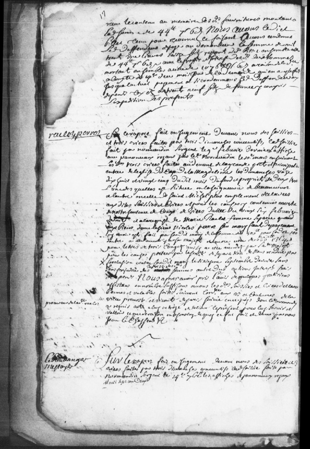 Le titre complet de la pièce se lit comme suit : Rapport de saisie et des trois criées faites par trois dimanches consécutifs devant la grande porte principale de l¿église du Cap-de-la-Madeleine du fond et propriété de deux terres, une en la seigneurie de Bécancour et l¿autre en celle de Saint-Michel, selon la sentence du 26 février dernier et à la requête de Marie Raclot (Raclos), femme séparée de biens avec le sieur Nicolas Perrot (Perrault), son mari, faute de paiement; les saisies et criées sont déclarées bonnes et valables après l¿avis de praticiens.La saisie est prise pour la somme de 500 livres pour sa dot, 100 livres accordées par Sa Majesté, 666 livres, 13 sols et 4 deniers pour des lettres de trois congés accordées aussi par Sa Majesté pour les causes portées par la sentence de séparation le 6 septembre dernier.