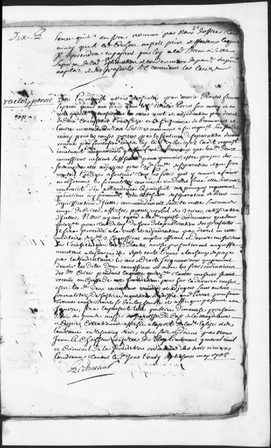 Le titre complet de la pièce se lit comme suit : Ordonnance de Jean Le Chasseur (Lachasseur), conseiller du Roi, lieutenant-général civil et criminel de la Juridiction ordinaire des Trois-Rivières, de la mise à l¿enchère par décret de deux concessions, l¿une sise en la seigneurie de Bécancour et l¿autre en celle de Dutort, saisies réellement à la requête de Marie Raclot (Raclos) sur Nicolas Perrot (Perrault), son mari, pour les causes portées contre lui le 6 septembre 1702, il est donc ordonné à quinzaine la vente et adjudication par décret au plus offrant et dernier enchérisseur sur l¿enchère que ladite Raclot a présentement mise à la somme de 700 livres et à la charge de payer par l¿adjudication les cens et droits seigneuriaux que peuvent devoir les deux concessions et les frais ordinaires des criées.