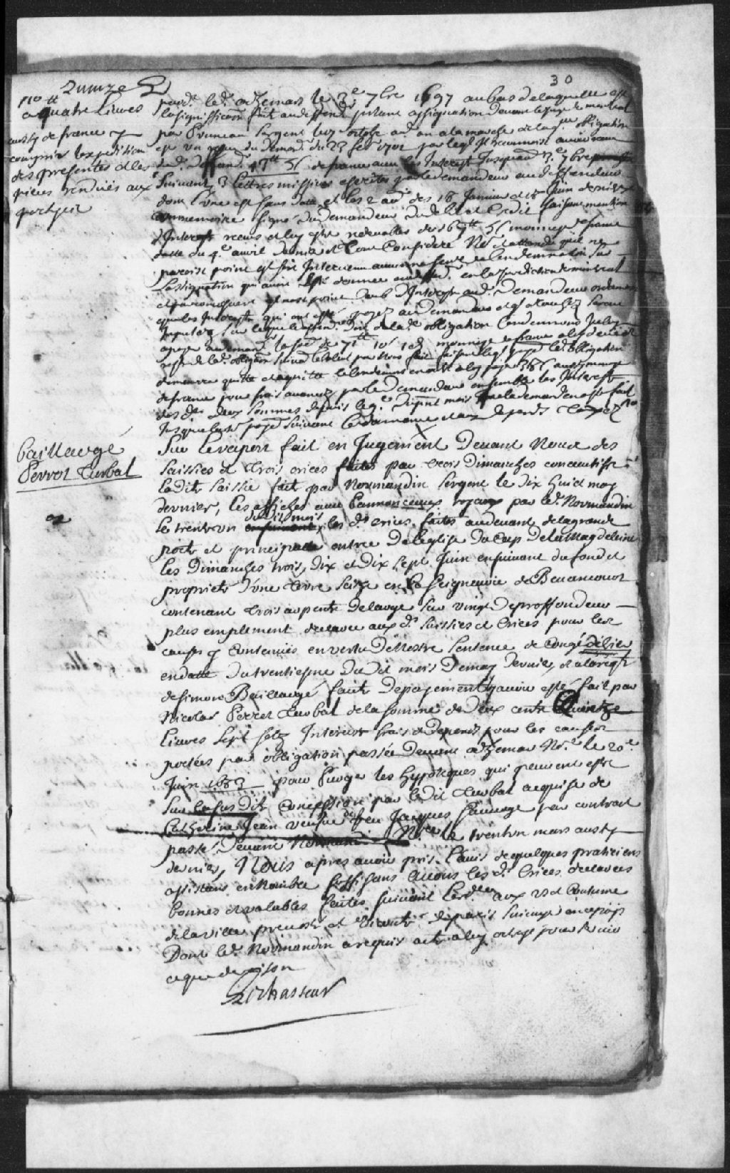 - Le titre complet de la pièce se lit comme suit : Rapport et certification de saisie à la requête de Normandin pour déclarer bonne et valable la saisie faite par ledit Normandin, sergent, le 18 mai dernier, et des criées qui ont été faites par trois dimanches consécutifs soit les 3, 10 et 17 juin du fond et propriété d¿une terre sise en la seigneurie de Bécancour contenant 3 arpents de large sur 20 arpents de profondeur selon une sentence du 30 mai dernier, et à la requête de Simon Baillargé contre Nicolas Perrot (Perrault) Turbal qui ne lui a pas payé la somme de 215 livres et 7 sols intérêts, frais et dépens pour les causes portées par une obligation passée devant le notaire Adhémar le 20 juin 1683 pour purger les hypothèques qui peuvent être sur la concession acquise par Turbal de Catherine Jean, veuve de feu Jacques Sauvage, par un contrat passé devant notaire Normandin le 31 mars dernier; après l¿avis de praticiens assistants en [...]