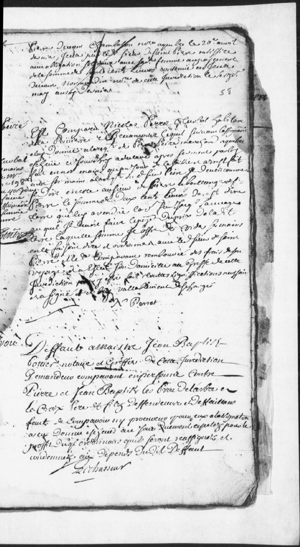 Le titre complet de la pièce se lit comme suit : Comparution de Nicolas Perrot (Perrault) Turbal, habitant de la rivière de Bécancour, lequel à la requête de Pierre Peiré, marchand à Québec, déclare après serment qu¿au jour de la saisie et arrêt fait entre ses mains à la requête du sieur Peiré il devait, comme il doit encore, au sieur de Pierre Leboulanger (Boulanger) de Saint-Pierre la somme de 200 livres de reste d¿une terre que lui a vendue la veuve de feu Jacques Sauvage auquel il devait faire le paiement du prix de la terre, laquelle somme il offre de vider ses mains en la faisant dire et ordonner avec le sieur de Saint-Pierre, ledit Perrot remboursé des frais de son voyage; il est valablement déchargé.