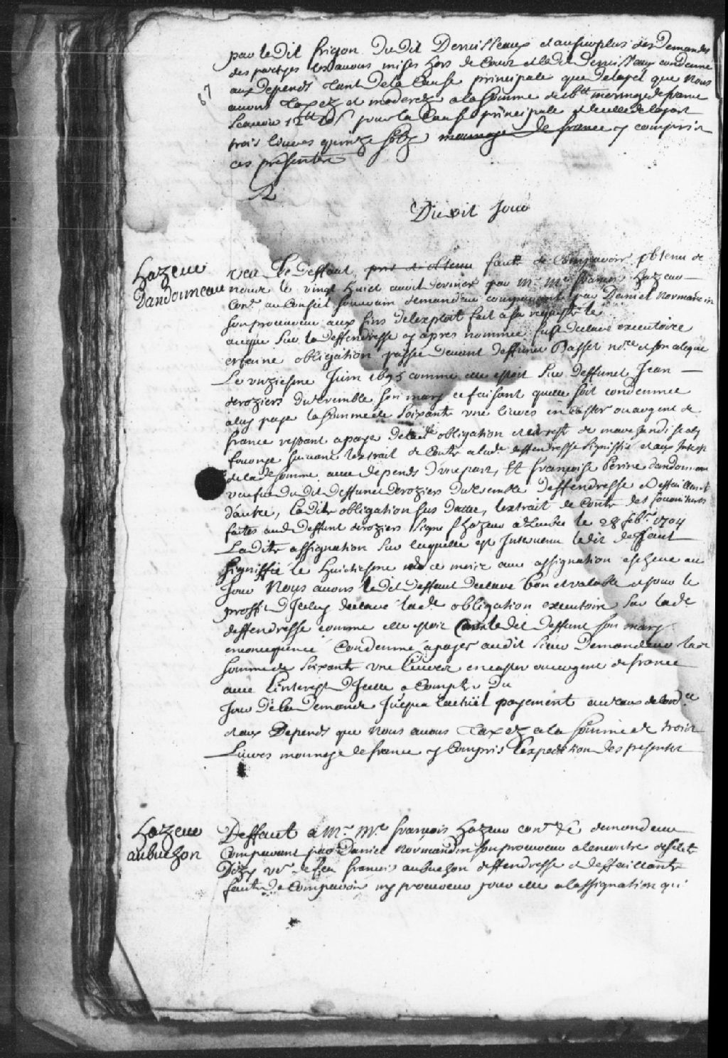 - Le titre complet de la pièce se lit comme suit : Défaut en instance par maître François Hazeur, conseiller au Conseil souverain, demandeur, comparant par Daniel Normandin, contre Françoise-Périne Dandonneau, veuve de feu Jean Desrosiers du Tremble (Dutremble), défenderesse et défaillante, pour que cette dernière soit tenue de lui payer la somme de 61 livres en castor ou argent de France restante à payer de l¿obligation du 11 juin 1695 et pour le reste de marchandises à lui fournies suivant l¿extrait de compte à ladite défenderesse et aux intérêts de la somme; le défaut est déclaré bon et valable alors que l¿obligation est déclarée exécutoire sur la défenderesse; Dandonneau est condamné à payer au demandeur la somme de 61 livres en castor ou argent de France avec intérêts à compter du jour de la demande jusqu¿à l¿actuel paiement au taux de l¿ordonnance et aux dépens taxés à 3 livres monnaie de France.On mentionne des pièces du défaut obtenu le 28 avril dernier, l¿extrait de compte des fournitures faites au défunt Desrosiers signé Hazeur à Québec le 28 février 1704, une assignation signifiée du 8 de ce mois.