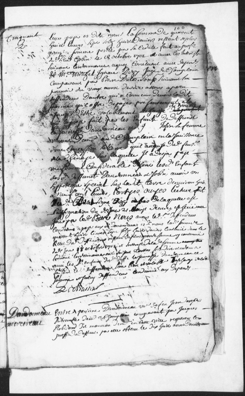 Requête de Perrine Dandonneau, veuve de feu Jean Derosiers (Desrosiers) du Tremble (Dutremble), demeurant à Champlain, demanderesse, comparant par Jacques Robidard (Robidas) dit Manceau (Manseau), contre Pierre Mercereau de Champlain, défendeur...
