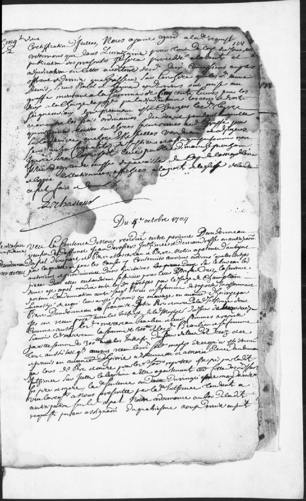 Appel entre Perrine Dandonneau, veuve de feu Jacques Derosiers (Desrosiers), intimée et demanderesse en anticipation d’appel, contre Pierre Mercereau et Pierre Molin (Moulin), appelants..., 4 octobre 1704, Archives nationales à Trois-Rivières, Fonds Juridiction royale des Trois-Rivières, (04T,TL3,S11,P2728).