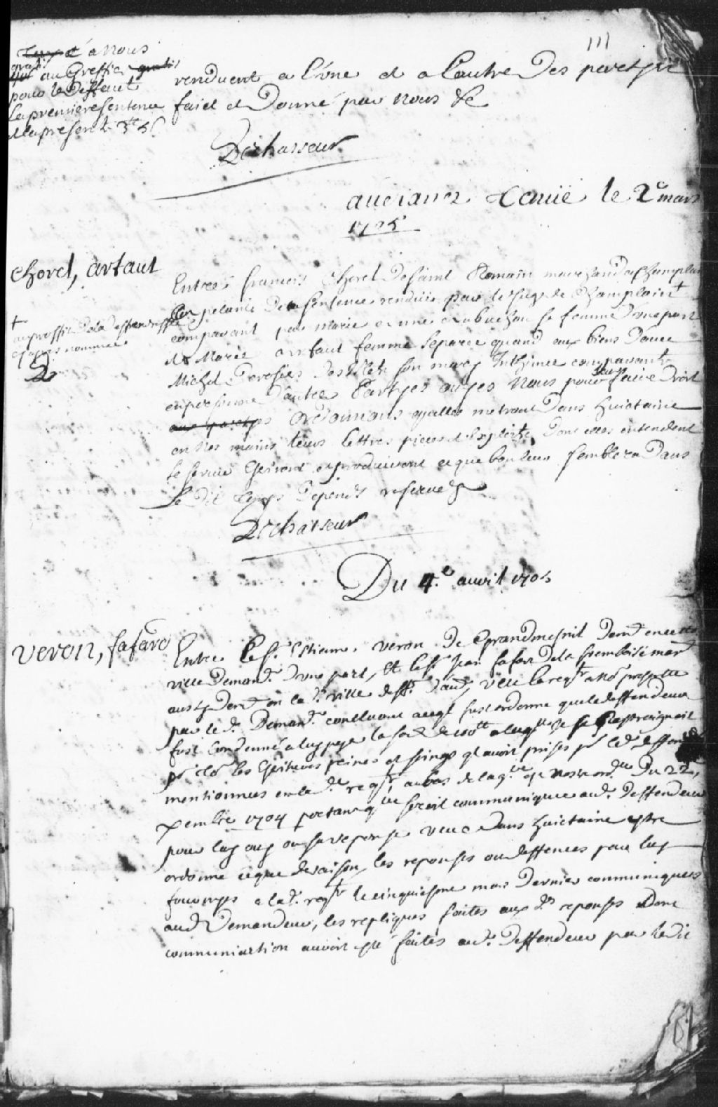 Appel de François Chorel de Saint-Romain, appelant comparant par Marie-Anne Aubuchon, contre Marie Arfaut (Artault), femme séparée quant aux biens d’avec Michel Derosiers (Desrosiers) des Islets (Désilets), son mari, intimée..., 2 mars 1705, Archives nationales à Trois-Rivières, Fonds Juridiction royale des Trois-Rivières, (04T,TL3,S11,P2734).