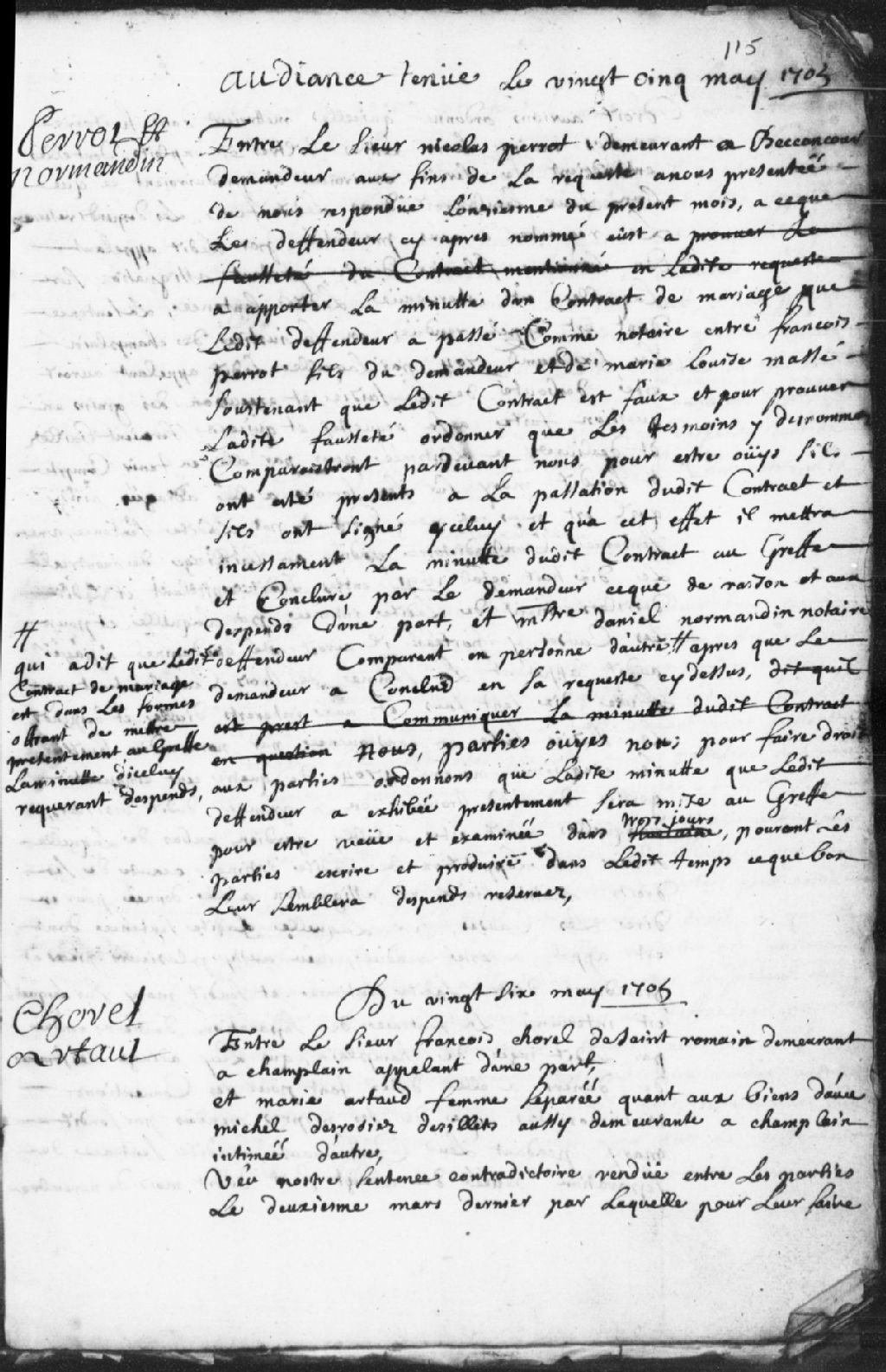 Requête de Nicolas Perrot (Perrault), demeurant à Bécancour, demandeur, contre maître Daniel Normandin, notaire, défendeur..., 25 mai 1705, Archives nationales à Trois-Rivières, Fonds Juridiction royale des Trois-Rivières, (04T,TL3,S11,P2741).
