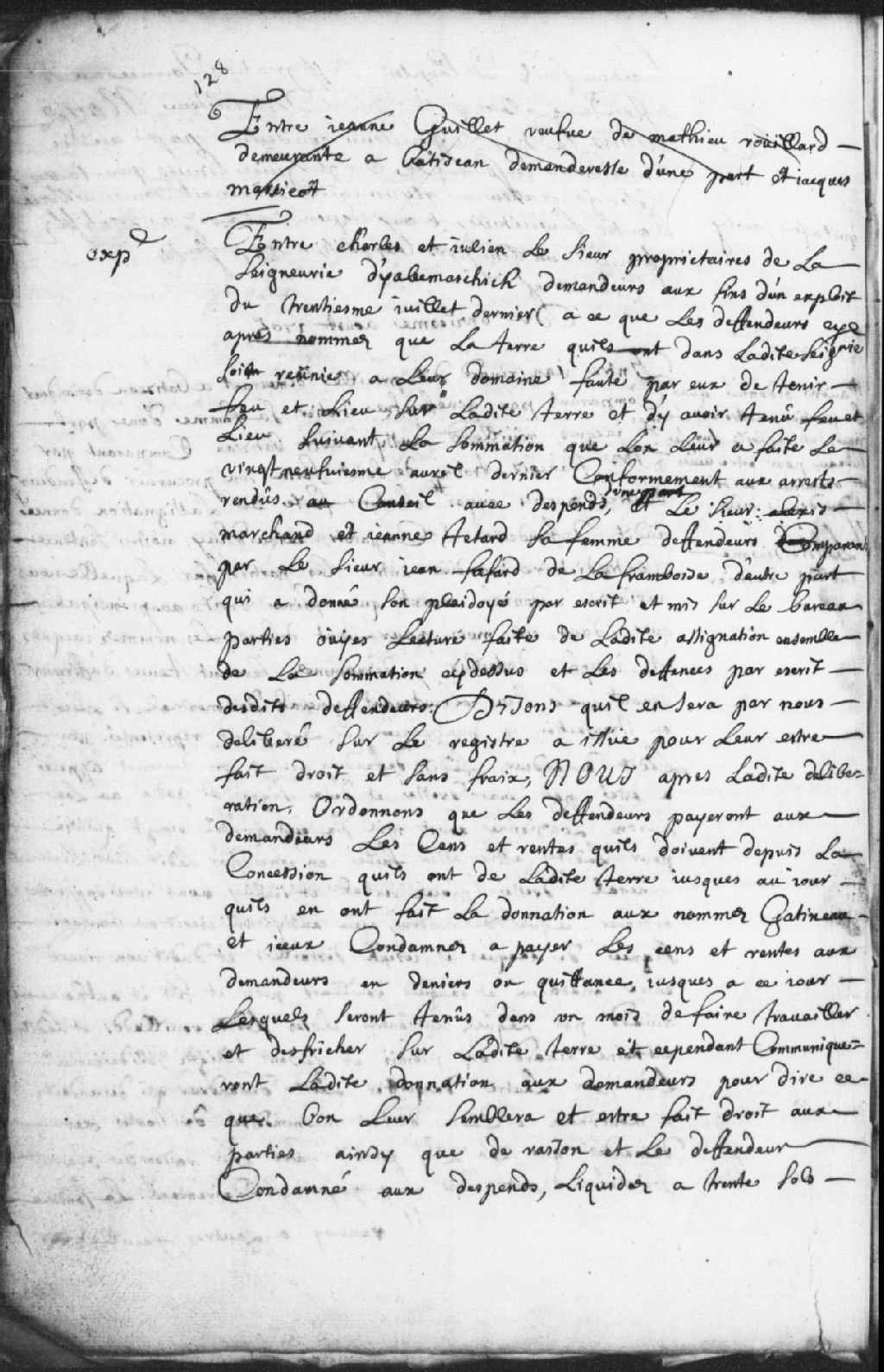 Le titre complet de la pièce se lit comme suit : Requête de Charles et Julien Le Sieur (Lesieur), propriétaires de la seigneurie de Yamachiche, demandeurs, contre Alexis Marchand et Jeanne Tetard (Tétard), sa femme, défendeurs comparant par Jean Fafard de Laframboise, pour que la terre que les défendeurs ont dans la seigneurie soit réunie à leur domaine faute par eux de tenir feu et lieu sur la terre et de n¿y avoir tenu feu et lieu suivant la sommation que l¿on leur a faite le 29 avril dernier; le défendeur comparant a donné son plaidoyer par écrit et mis sur le bureau; les défendeurs sont ordonnés à payer aux demandeurs les cens et rentes qu¿ils doivent depuis la concession qu¿ils ont de la terre jusqu¿au jour qu¿ils en ont fait la donation au nommé Gatineau, ils sont condamnés à payer les cens et rentes aux demandeurs en deniers ou quittance jusqu¿à ce jour et ils seront tenus dans 1 mois de faire travailler et défricher sur la [...]