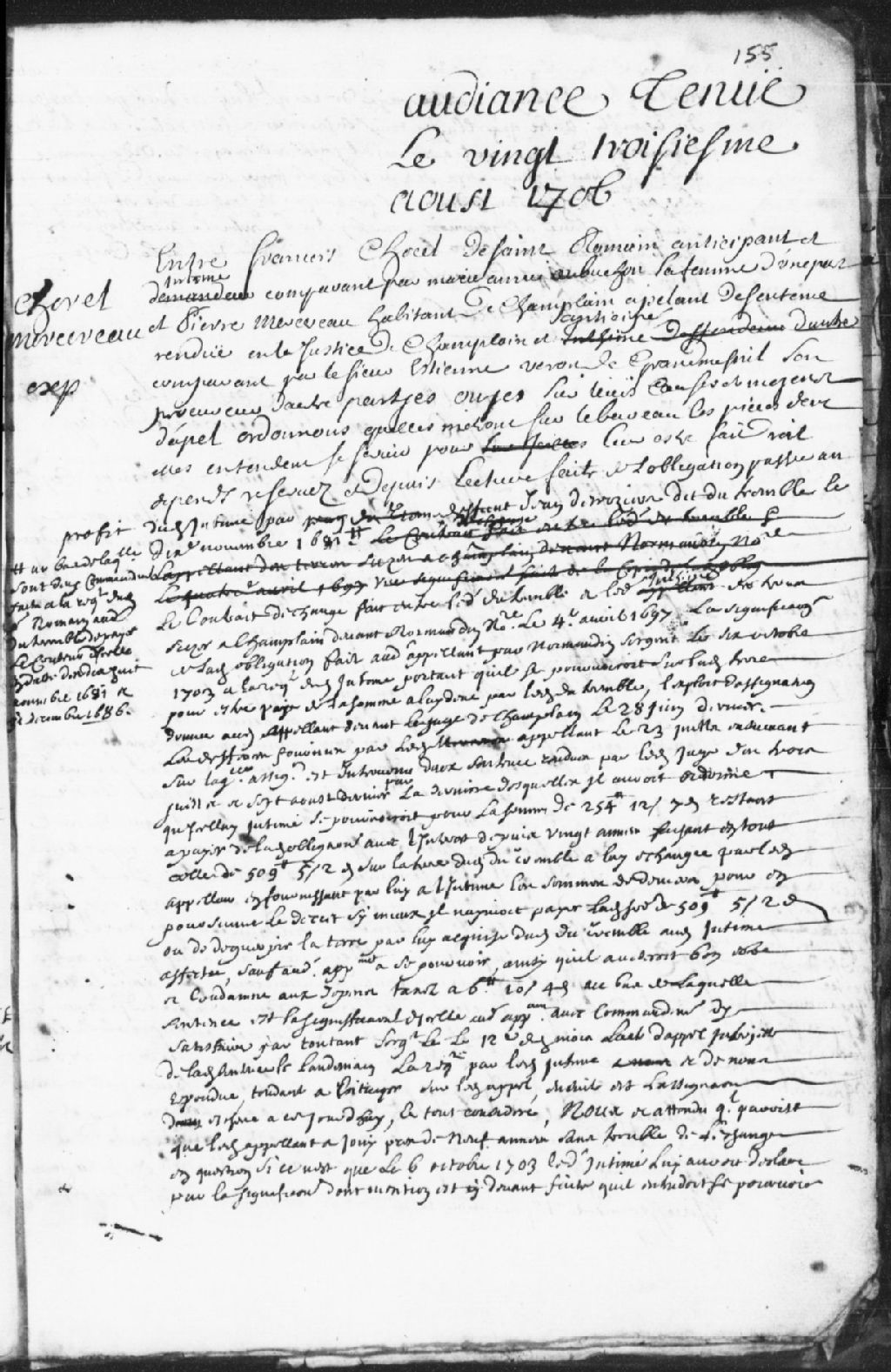 - Anticipation d’appel de François Chorel de Saint-Romain, comparant par Marie-Anne Aubuchon, contre Pierre Mercereau, appelant d'une sentence rendue en la justice de Champlain et anticipé, comparant par Étienne Veron de Grandmesnil (Grandménil)...
