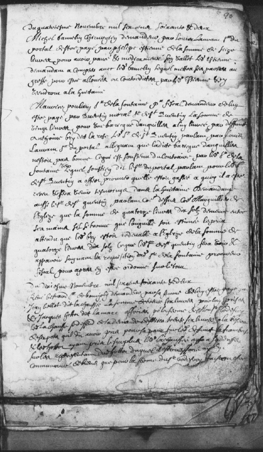 Requête de Michel Gamelin, chirurgien, par Louis Laurent sieur du Portail, son procureur, contre Philippe (Estienne) Étienne de la somme de 16 livres pour avoir pansé et médicamenté son valet. Ledit Estienne demande à compter avec ledit Gamelin. Ordonné que ledit Gamelin mette ses parties au greffe pour être allouées ou contredites par ledit Estienne dans huitaine, 4 novembre 1662, Archives nationales à Trois-Rivières, Fonds Juridiction royale des Trois-Rivières, (04T,TL3,S11,P281).