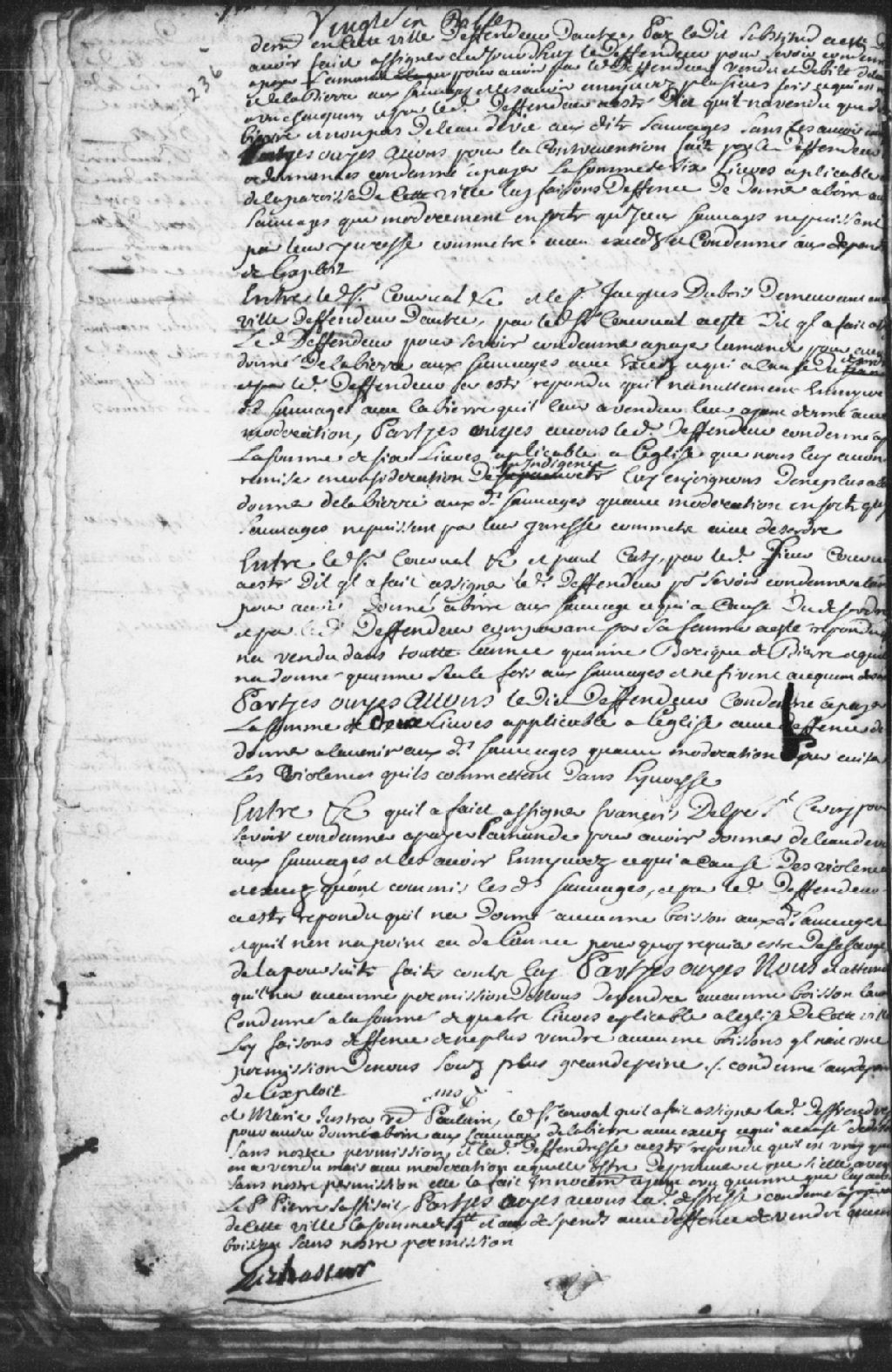Le titre complet de la pièce se lit comme suit : Requête du nommé Courval, demandeur, contre François Delpé Saint-Cerny (Saint-Sorny, Sincerny), défendeur, pour que ce dernier soit condamné à payer l¿amende pour avoir donné de l¿eau-de-vie aux Sauvages (Amérindiens) et les avoir enivrés ce qui a causé des violences et des excès commis par les Sauvages en question; le défendeur répond qu¿il n¿a donné aucune boisson aux Sauvages et qu¿il n¿en a point eu de l¿année, requérant être déchargé de la poursuite faite contre lui; comme le défendeur n¿a point de permission de vendre aucune boisson, il a été condamné à la somme de 4 livres applicable à l¿église de Trois-Rivières alors que défense lui est faite de ne plus vendre aucune boisson sans avoir de permission, risquant une plus grande peine, en plus d'être condamné aux dépens de l¿exploit.
