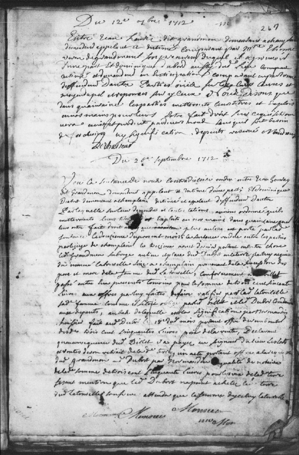 Appel de Jean Houray dit Grandmon (Grandmont), demandeur, appelant et intimé, contre Dominique Dubort (Dubord), demeurant à Champlain, intimé et appelant, défendeur, concernant une concession de terre sise à Champlain, acquise d’un nommé Latourelle selon la sentence contradictoirement rendue le 12 septembre dernier; il est dit que l’appel du 30 août a été mal jugé et que la terre n’a pu être vendue ni disposée par ledit Latourelle puisqu’elle appartient à sa femme, 20 septembre 1712, Archives nationales à Trois-Rivières, Fonds Juridiction royale des Trois-Rivières, (04T,TL3,S11,P2923).