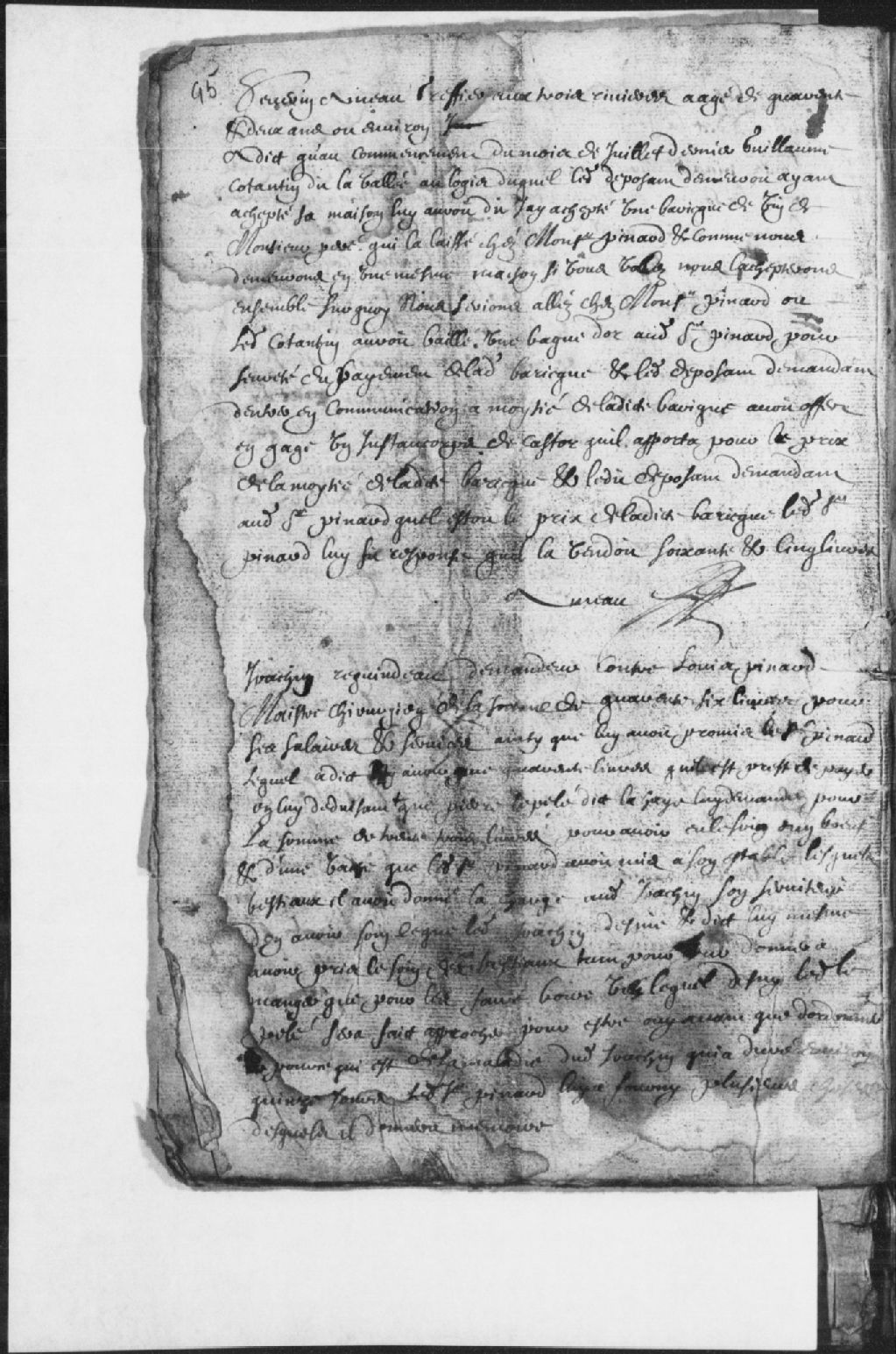 Témoignage de Séverin Ameau, greffier aux Trois-Rivières, affirmant que Guillaume Cotantin (Constantin) dit la Vallée (Lavallée) lui avait avoué avoir acheté une barrique de vin de Arnault Peré (Péré) qui l'a laissée chez Louis Pinard et que ledit Ameau lui avait proposé d'en payer chacun la moitié, étant donné qu'ils habitaient le même logis. De plus, il dit que ledit Pinard fixait le prix de la barrique à 65 livres