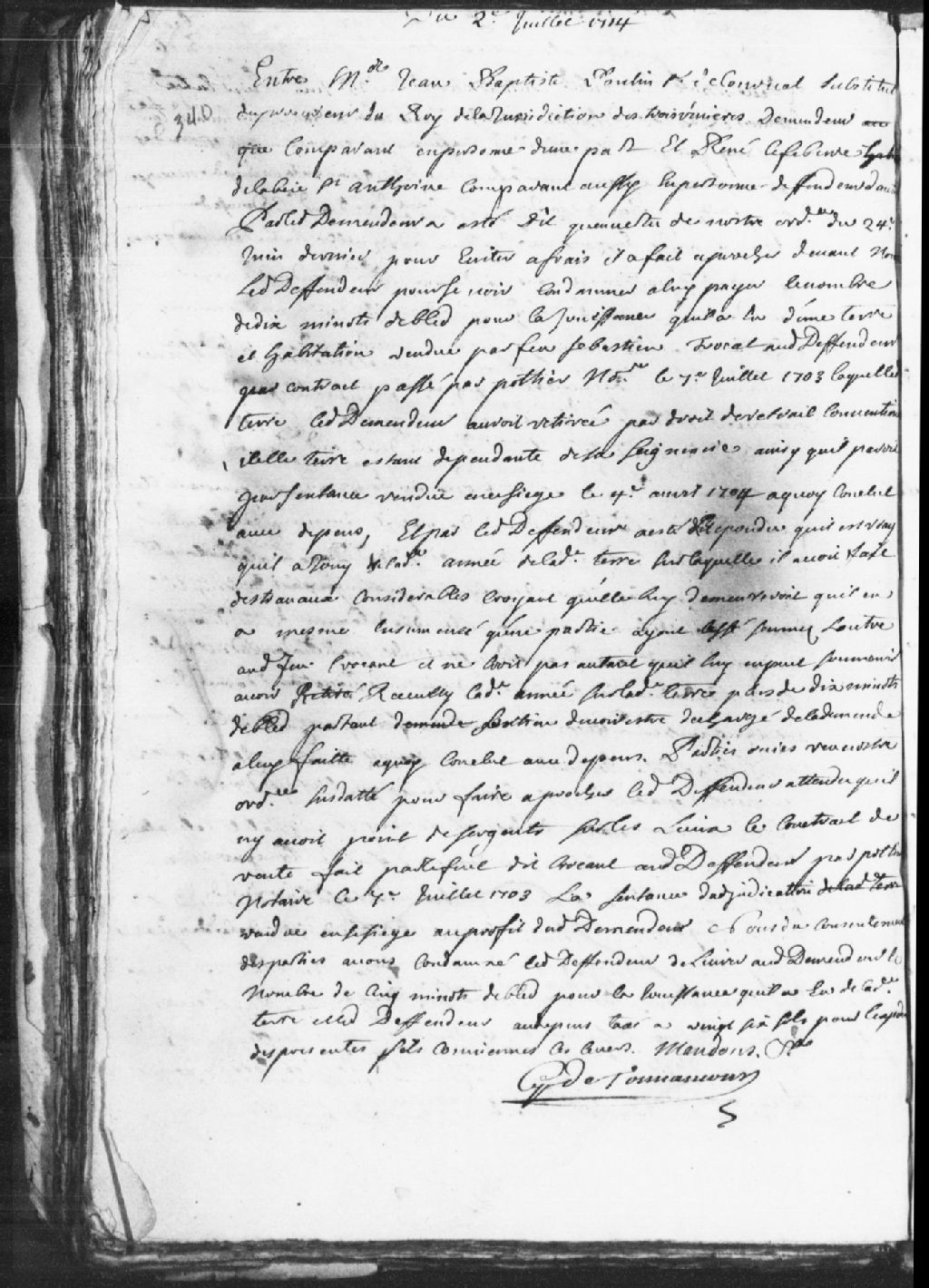 Requête de maître Jean-Baptiste Poulin, sieur de Courval, substitut du procureur du Roi de la Juridiction de Trois-Rivières, demandeur, contre René Lefebvre, habitant de la Baie-Saint-Antoine, défendeur..., 2 juillet 1714, Archives nationales à Trois-Rivières, Fonds Juridiction royale des Trois-Rivières, (04T,TL3,S11,P2987).