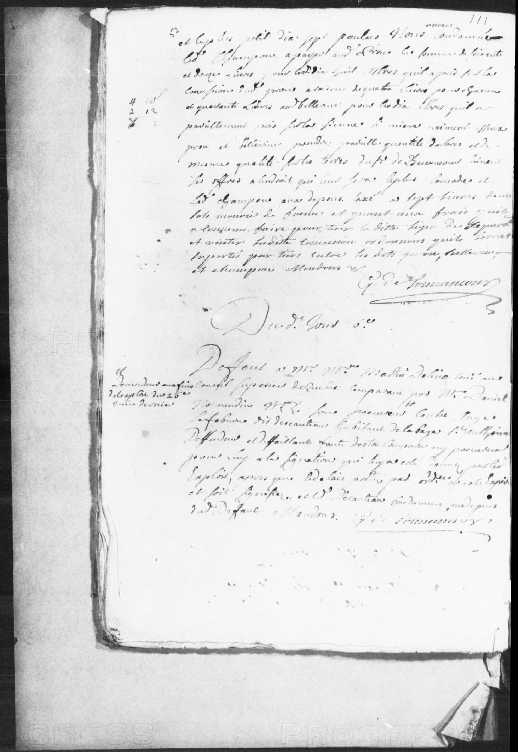 Défaut accordé à maître Martin Delino, conseiller au Conseil supérieur de Québec, comparant par Daniel Normandin, notaire royal et procureur, à l’encontre d’Ange Lefebvre dit Descôteaux, habitant de la Baie-Sainte-Antoine, défendeur et défaillant, faute d’être comparu à l’assignation, ledit défaillant est condamné aux dépens du défaut