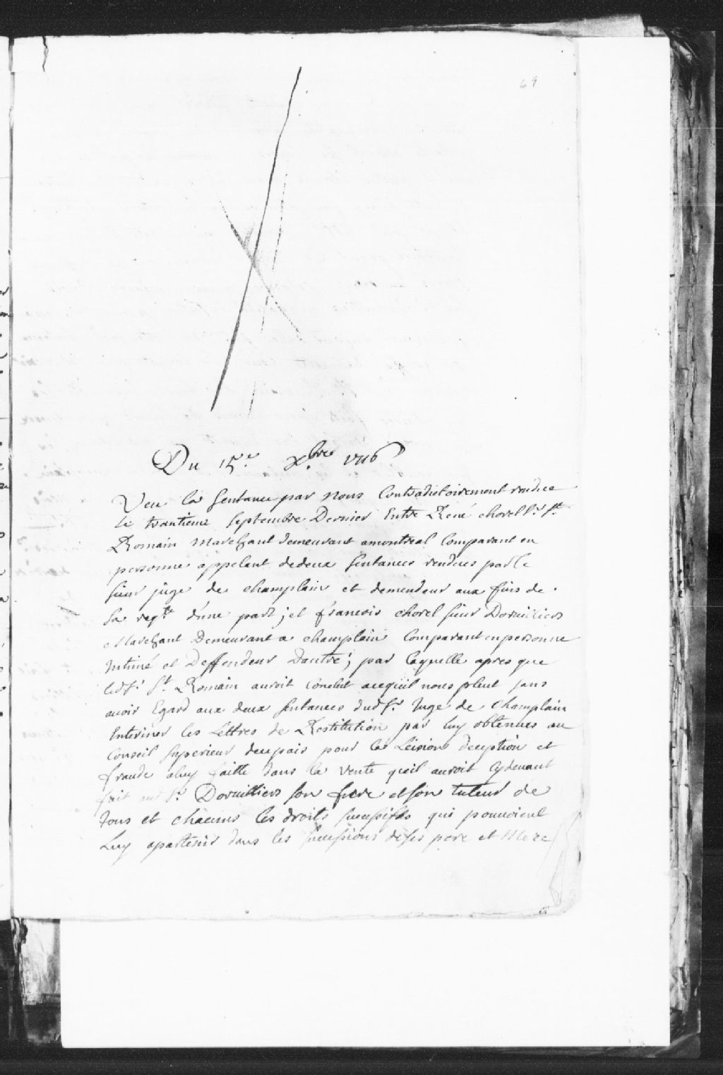 - Le titre complet de la pièce se lit comme suit : Appel d¿une sentence par René Chorel, sieur de Saint-Romain, marchand demeurant à Montréal, demandeur et appelant de deux sentences rendues par le juge de Champlain, d'une part, contre François Chorel, sieur Dorvilliers, marchand demeurant à Champlain, intimé et défendeur d¿autre part. Par la sentence rendue le 3 septembre dernier, il avait été ordonné que le défendeur produise au greffe de cette Cour les pièces qu¿il avait présentées au demandeur, son frère, lorsque ce dernier a lui vendu par contrat les droits successifs qu¿il possédait sur la succession de leurs père et mère, soit un compte, les inventaires après décès de leurs parents, ainsi que le procès-verbal des experts qui ont estimé les immeubles. Considérant que le défendeur n¿ait pas présenté au greffe les pièces demandées, et ce, deux mois après qu'elle ait rendu ladite sentence, et encore que l¿appelant a obtenu des lettres de restitution et récession du Conseil supérieur de ce pays, la Cour, sans avoir égard au contrat de vente et aux sentences rendues par le juge de Champlain, a entériné lesdites lettres de restitution et de récession dudit appelant et ce faisant, elle déclare le contrat de vente nul et remet les parties en pareil état qu¿ils étaient avant la passation dudit contrat. Le défendeur est condamné aux dépens taxés à 50 livres de France.