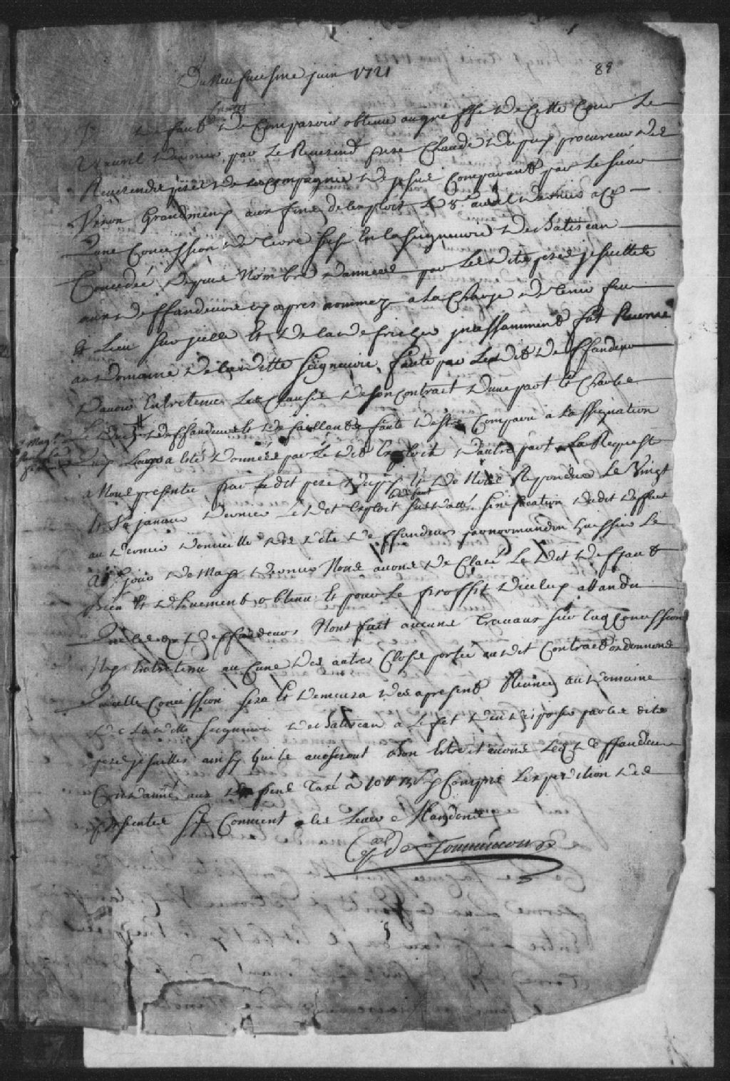 Défaut accordé au Révérend Père Claude Dupuis, comparant par Étienne Veron de Grandmesnil, notaire royal, demandeur, d’une part, à l’encontre de Charles Leduc et Madeleine Viel (Vielle), sa femme, défendeurs..., 9 juin 1721, Archives nationales à Trois-Rivières, Fonds Juridiction royale des Trois-Rivières, (04T,TL3,S11,P3084).