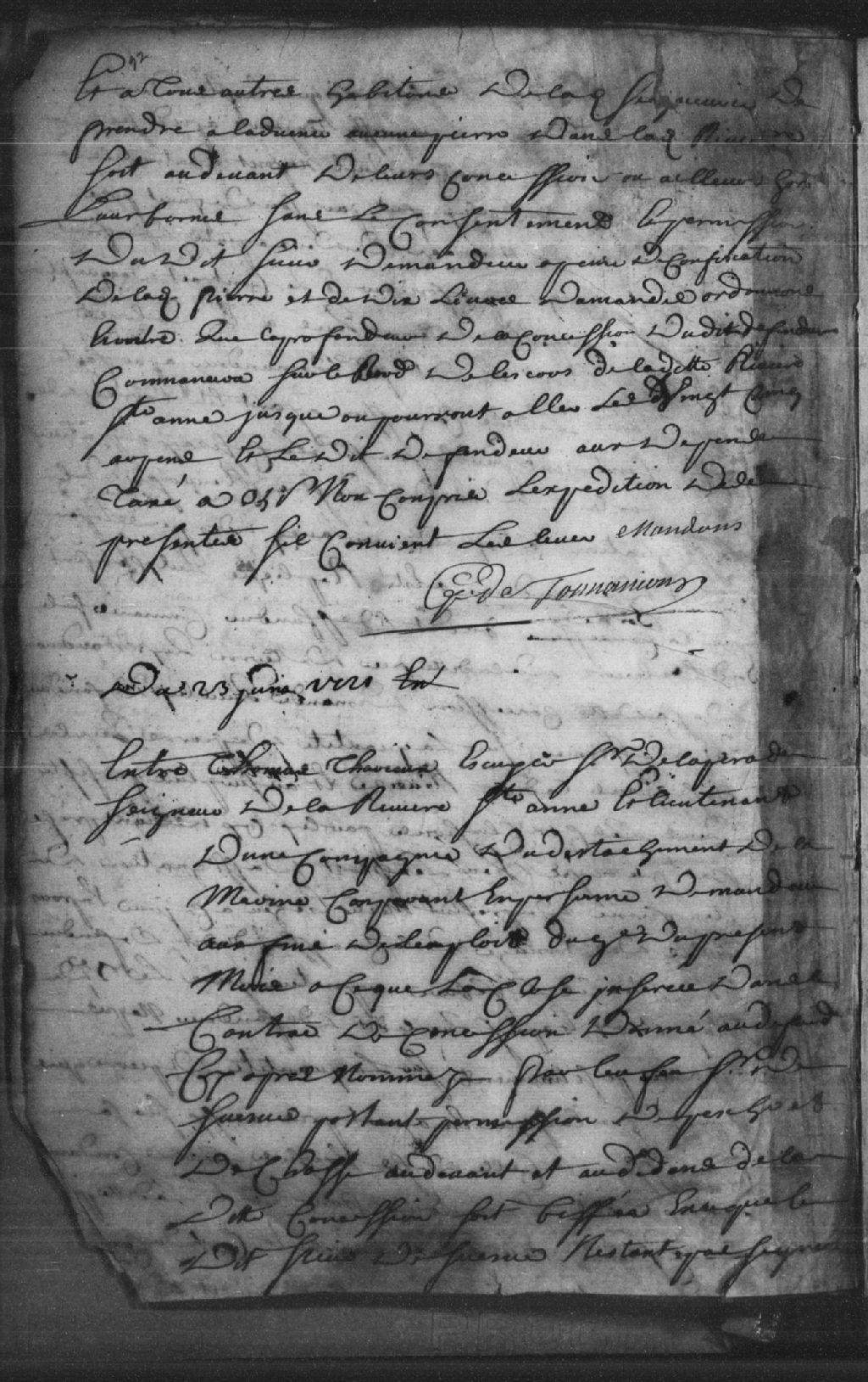 - Le titre complet de la pièce se lit comme suit : Requête de Thomas Tharieux (Tarieu), écuyer, sieur de la Pérade et seigneur de la Rivière Saint-Anne, lieutenant d¿une compagnie du détachement de la Marine, demandeur, d¿une part, à l¿encontre de Jean Guibaud (Guibault), habitant demeurant à ladite Rivière Sainte-Anne. Le demandeur requiert que la clause insérée dans le contrat de concession, par le feu sieur de Suève, portant la permission de pêche et de chasse au-devant et au-dedans de ladite concession, soit biffée étant donné que ledit Suève n¿est plus seigneur de cette partie de fief. Lecture faite du contrat de concession fait par le sieur de Suève au profit du défendeur devant maître Michel Roy, notaire, la Cour a déchargé ledit défendeur alors que ledit demandeur est condamné aux dépens taxés à 35 sols.