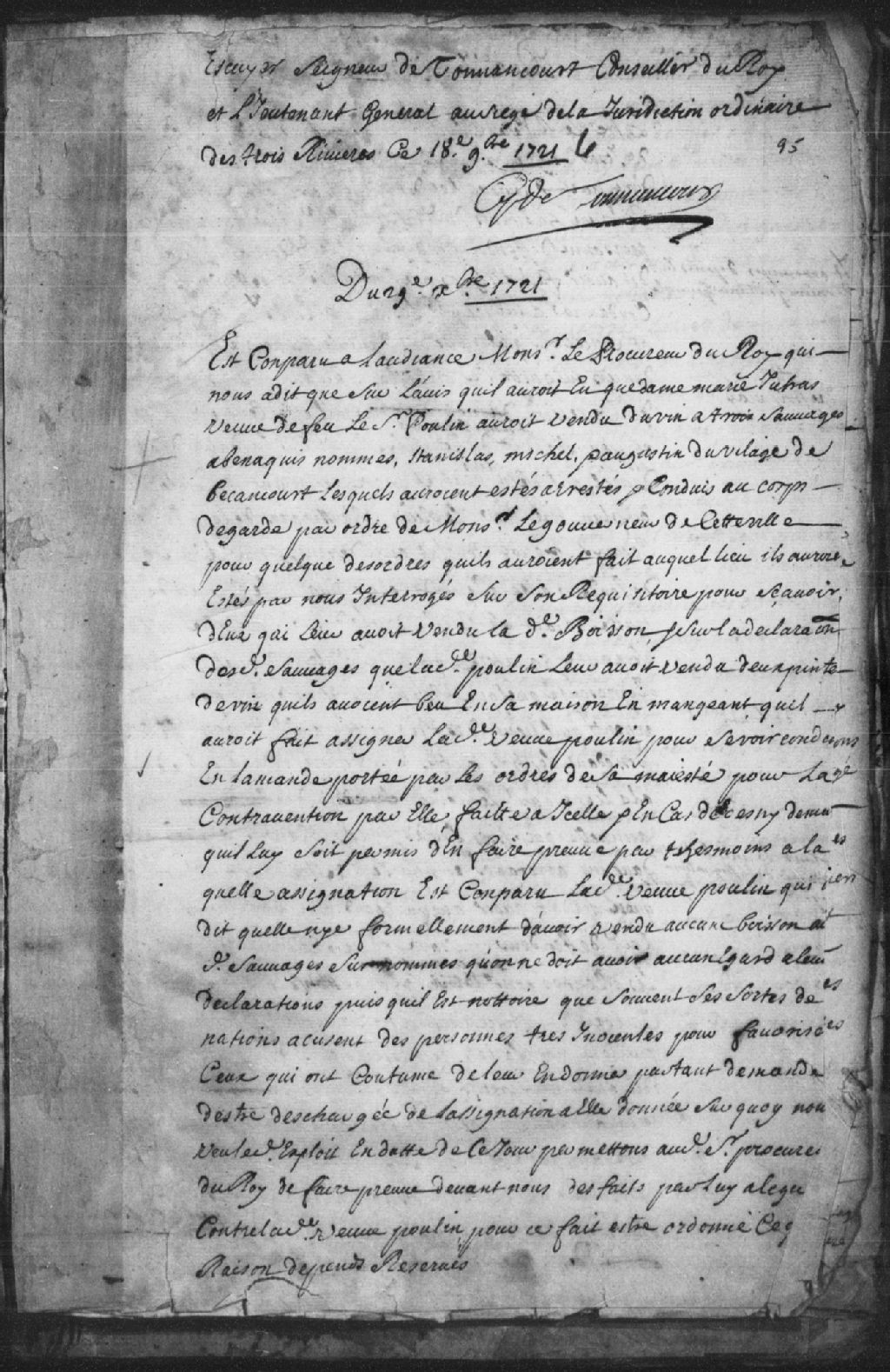 Le titre complet de la pièce se lit comme suit : Comparution de Marie Jutras, veuve du feu sieur Poulin, à la requête du procureur du Roi, laquelle aurait vendu du vin à trois Sauvages (Amérindiens) abénaquis nommés Stanislas, Michel et Augustin du village de Bécancour, lesquels ont été arrêtés et conduits au corps de garde par ordre du gouverneur de Trois-Rivières. Lesdits Sauvages ont déclaré que ladite veuve Poulin leur a vendu deux pintes de vin alors que l'accusée se défend formellement de leur avoir vendu de l¿alcool et du vin, affirmant qu¿il ne faut prêter aucun égard à leurs déclarations puisqu¿il est notoire que ces sortes de nations accusent des personnes innocentes pour favoriser les personnes qui ont coutume de leur en donner; la Cour permet au procureur du Roi de faire preuve de ce qu¿il allègue, dépens réservés.