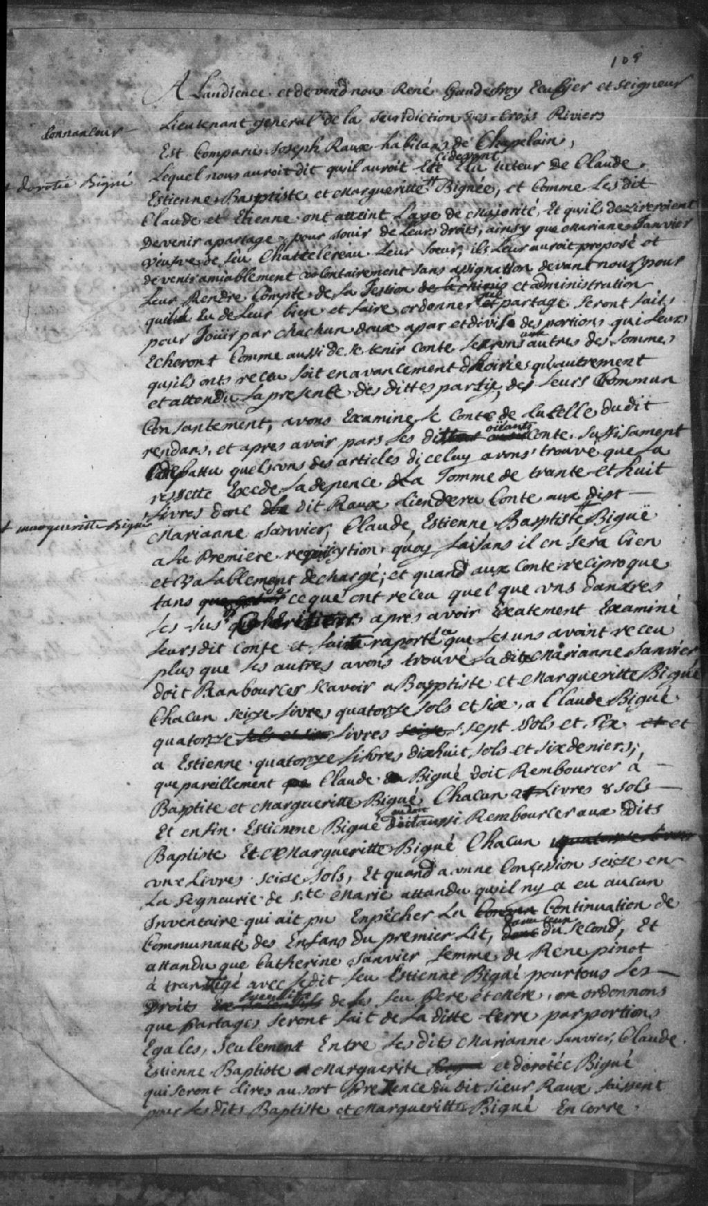 - Le titre complet de la pièce se lit comme suit : Comparution de Joseph Raux (Rault), habitant de Champlain, tuteur de Claude Biguet, Étienne Biguet, Baptiste Biguet et Marguerite Biguet, étant donné que lesdits Claude et Étienne ont atteint l¿âge de maturité et qu¿ils désirent jouir de leurs droits, ainsi que Marie-Anne Janvier, veuve du feu sieur Chattelereau (Châtellerault), leur soeur, pour leur rendre compte de la gestion qu¿il a fait de leurs biens et pour faire ordonner le partage desdits biens entre eux, comme pour tenir compte des sommes qu¿ils ont pu recevoir en avance d¿hoirie ou autre. La Cour, examinant les comptes, distribue les sommes et quant à la concession située à la seigneurie de Sainte-Marie, il y a continuation de la communauté du premier lit dans celui du deuxième, faute d'inventaire, et attendu que Catherine Janvier, femme de René Pinot (Pineau, Pinault), a transigé avec feu Étienne Biguet tous les droits successifs de leurs feus père et mère, la Cour ordonne un partage à parts égales de ladite terre entre Marie-Anne Janvier, Claude, Étienne, Baptiste, Margurite et Dorothée Biguet.