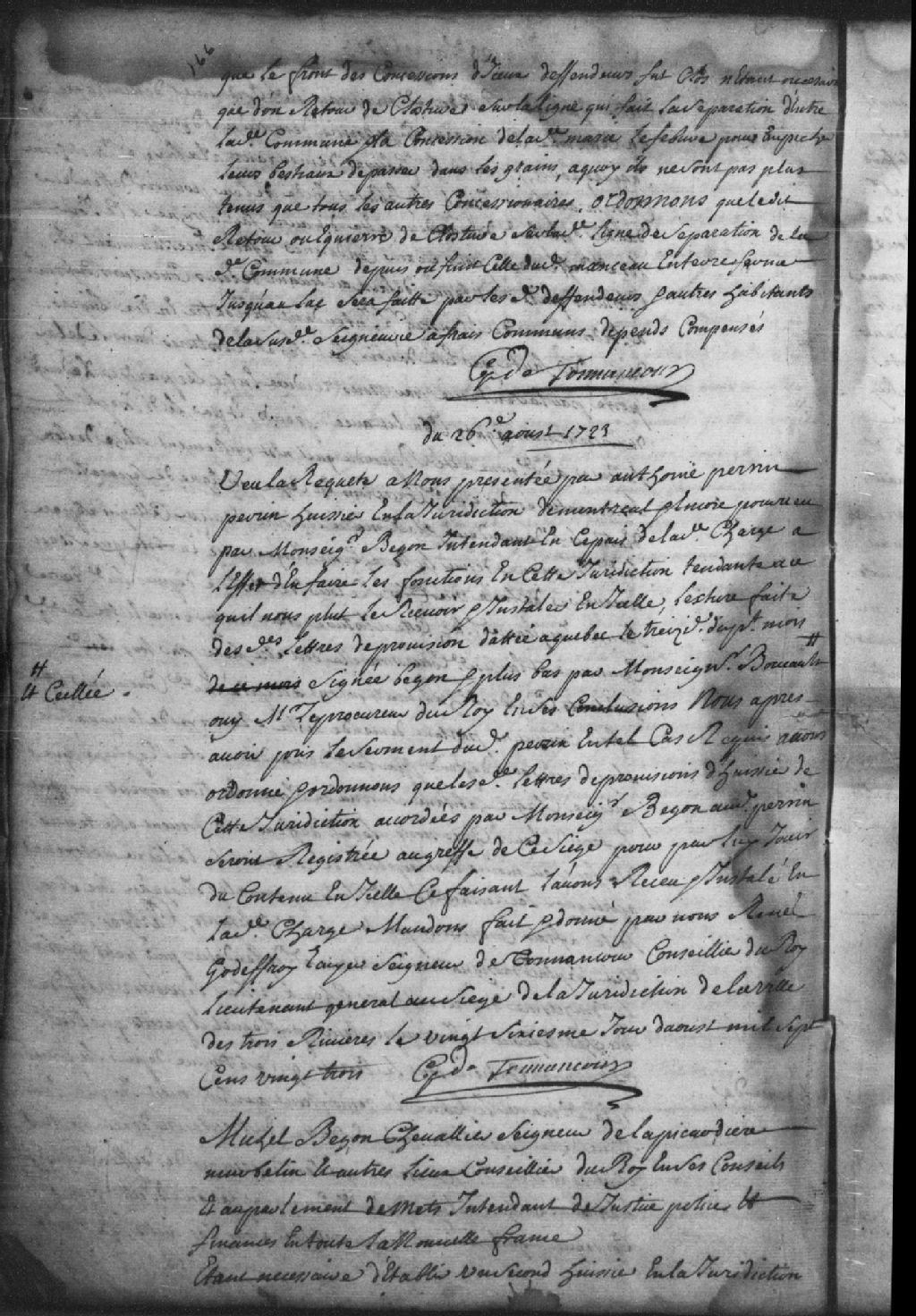 Nomination d’Antoine Perrin à la charge d’huissier de la Juridiction des Trois-Rivières, vu la requête présentée par ledit Perrin, huissier de la Juridiction de Montréal. Lecture faite des lettres de provision datées à Québec et signées par Bégon et par monseigneur Boucault, la Cour ordonne que lesdites lettres de provision d’huissier accordées audit Perrin soient enregistrées au greffe de ce siège pour que ledit Perrin jouisse du contenu de celles-ci