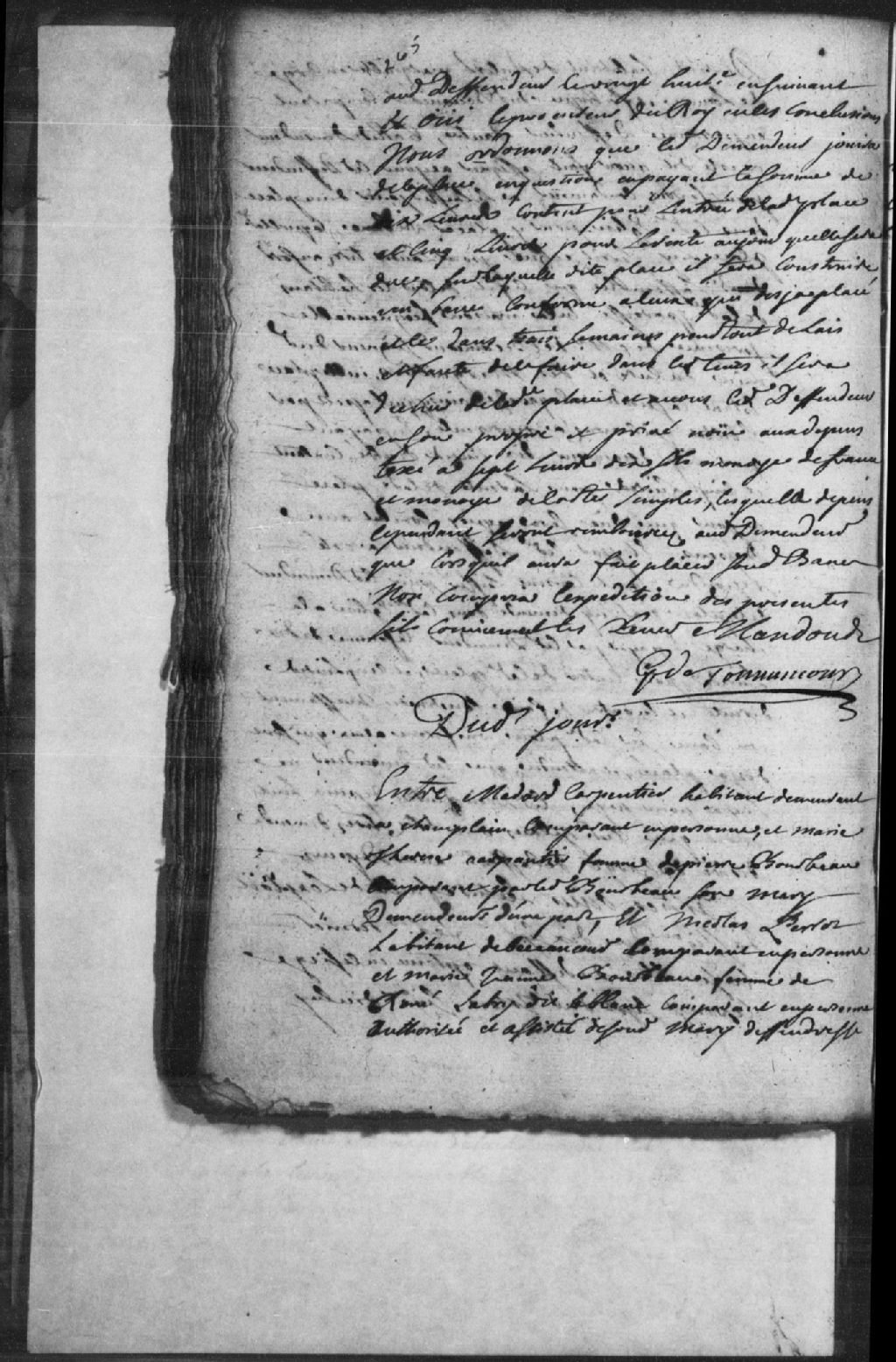 - Le titre complet de la pièce se lit comme suit : Requête de Médard Carpentier, habitant demeurant à Champlain, et Marie-Thérèse Carpentier, femme de Pierre Bourbeau, comparant par son mari, demandeurs, d¿une part, contre Nicolas Perrot (Perrault), habitant demeurant à Bécancour, et Marie-Jeanne Bourbeau, femme de René Labry (Labrie) dit Leblanc, assistée de son mari, défendeurs, d¿autre part. Les demandeurs ont fait assigner les défendeurs pour qu'ils soient condamnés à faire réparation pour les injures qu¿ils ont proférées contre leur honneur et celui de leur famille à la porte de l¿église de Bécancour, lesdits défendeurs répondant que ladite Carpentier les a entrepris parce qu¿ils refusent de consentir au mariage que la demanderesse entendait faire de Noël Carpentier, son frère, avec Marie-Anne-Geneviève Bourbeau, leur soeur; la Cour met les parties hors de Cour et les condamne à 10 livres d¿amende chacun pour être contrevenus aux ordonnances de monseigneur Bauharnois (Beauharnois), intendant de la Nouvelle-France, en se querellant à la porte de leur église paroissiale avec scandale.