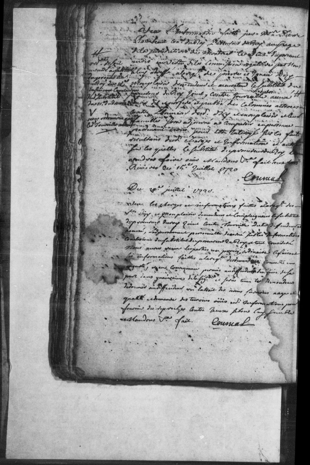Acte par lequel la Cour reçoit en procès ordinaire Pierre et Ignace Dizy (Disy) Monplaisir (Montplaisir), demandeurs et accusateurs, d’une part, contre Charles Dutos (Duteau) dit Tourville, défendeur et accusé, d’autre part, les demandeurs sont tenus de donner audit défendeur un extrait des noms, surnoms, âges, qualités et demeures de chacun des témoins ouïs pour fournir des reproches contre ces derniers si bon lui semble