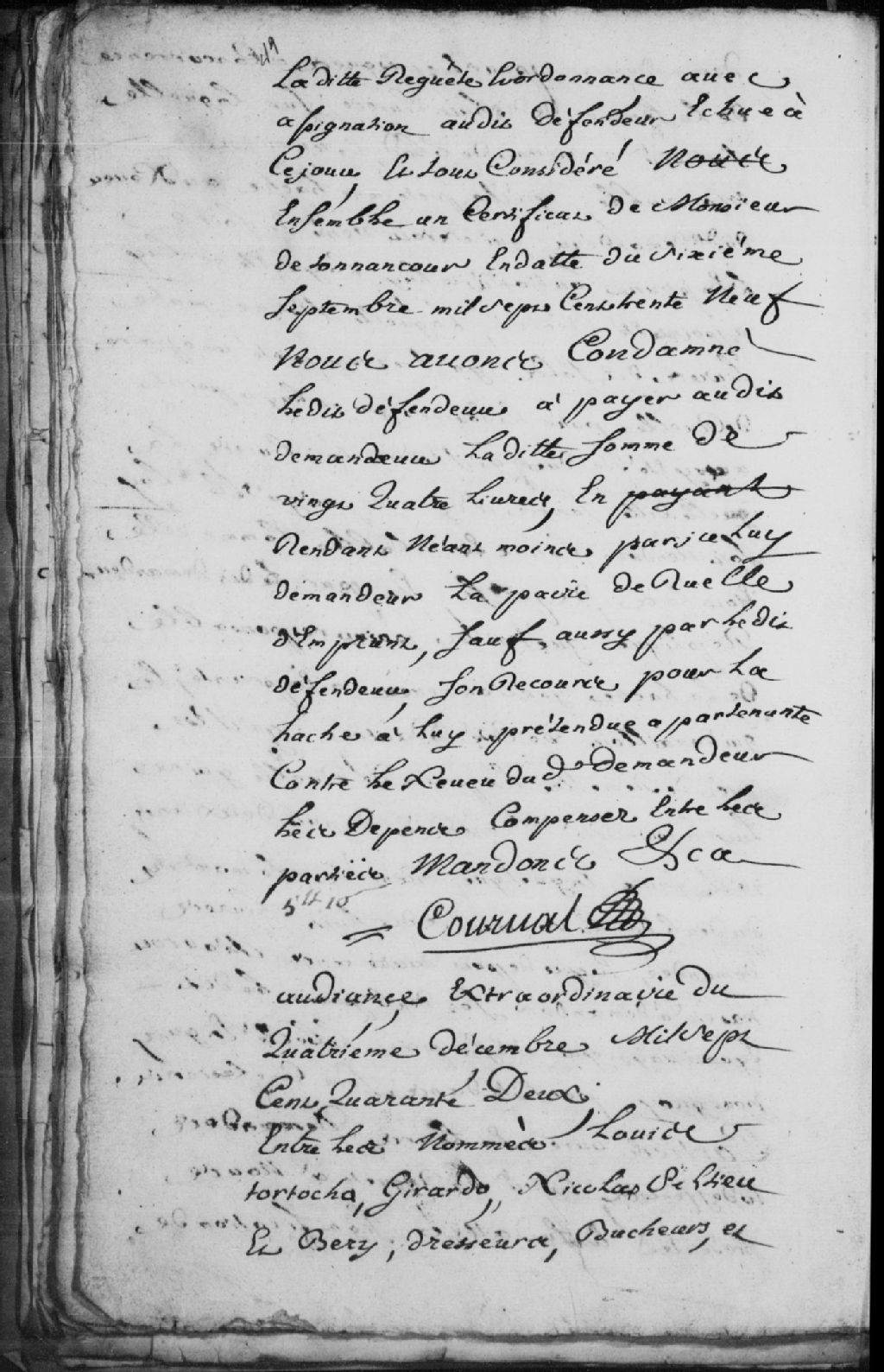 Le titre complet de la pièce se lit comme suit : Requête, lors d'une audience extraordinaire, des nommés Louis Tortocho (Tortochot), Girardo (Girardeau), Nicolas Peltier (Pelletier) et Bery (Berry), dresseurs, bûcherons et charbonniers aux Forges du Saint-Maurice, comparants en leur nom et ceux de leurs confrères, assistés de Gilles Bolvin, sculpteur, demeurant en cette ville, porteur de pièces, demandeurs, contre le sieur Perault (Perrault), marchand audites Forges du Saint-Maurice, pour la somme de 50 livres d'amende pour avoir contrevenu publiquement à l'arrêt de nos seigneurs du Conseil supérieur, concernant la taxe sur le prix du blé, de la farine et du pain; comme l'arrêt n'avait pas été publié audites Forges, avons déchargé le défendeur de l'action intentée contre lui et ordonné que l'arrêt soit publié dimanche prochain afin de s'y conformer, signé Courval.L'arrêt de nos seigneurs du Conseil supérieur, concernant la taxe sur le blé et la farine, est daté du 25 octobre dernier et le directeur et caissier des Forges du Saint-Maurice est le sieur Martel.