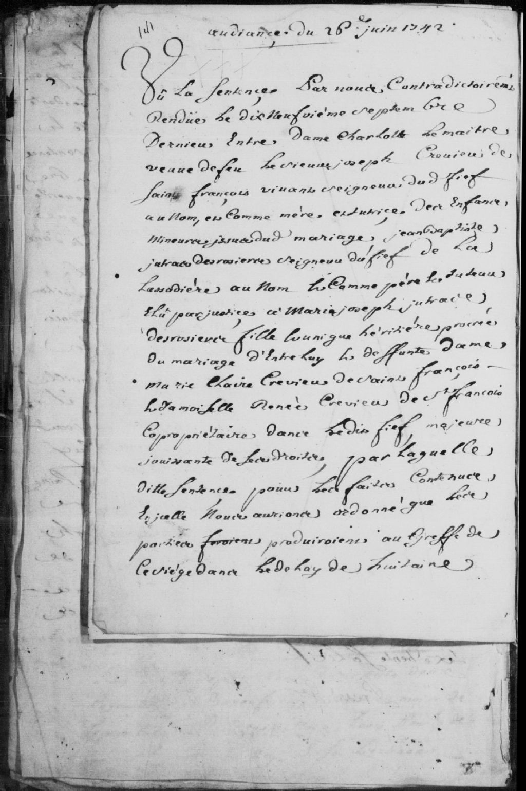 - Le titre complet de la pièce se lit comme suit : Comparution de dame Charlotte Lemaitre (Lemaître), veuve de feu Joseph Crevier de Saint-François, seigneur dudit fief de son vivant, comme mère et tutrice des enfants mineurs issus de leur mariage, Jean-Baptiste Jutras dit Desrosiers, seigneur du fief de la seigneurie de Lalussodière, comme père et tuteur élu par justice de Marie-Josèphe Jutras Desrosiers, sa fille unique et de sa défunte femme Marie-Claire Crevier de Saint-François et demoiselle Renée Crevier de Saint-François, majeure et copropriétaire dudit fief, contre François Baby (Babie) dit Cheneville, légataire de feue demoiselle Élisabeth Crevier, défendeur, suivant la requête du 19 septembre dernier qui ordonnait aux parties de produire au greffe leurs pièces.Sont aussi concernés Gilles Bolvin, sculpteur, procureur du sieur Gamelin, exécuteur testamentaire de feue demoiselle Élisabeth Crevier.