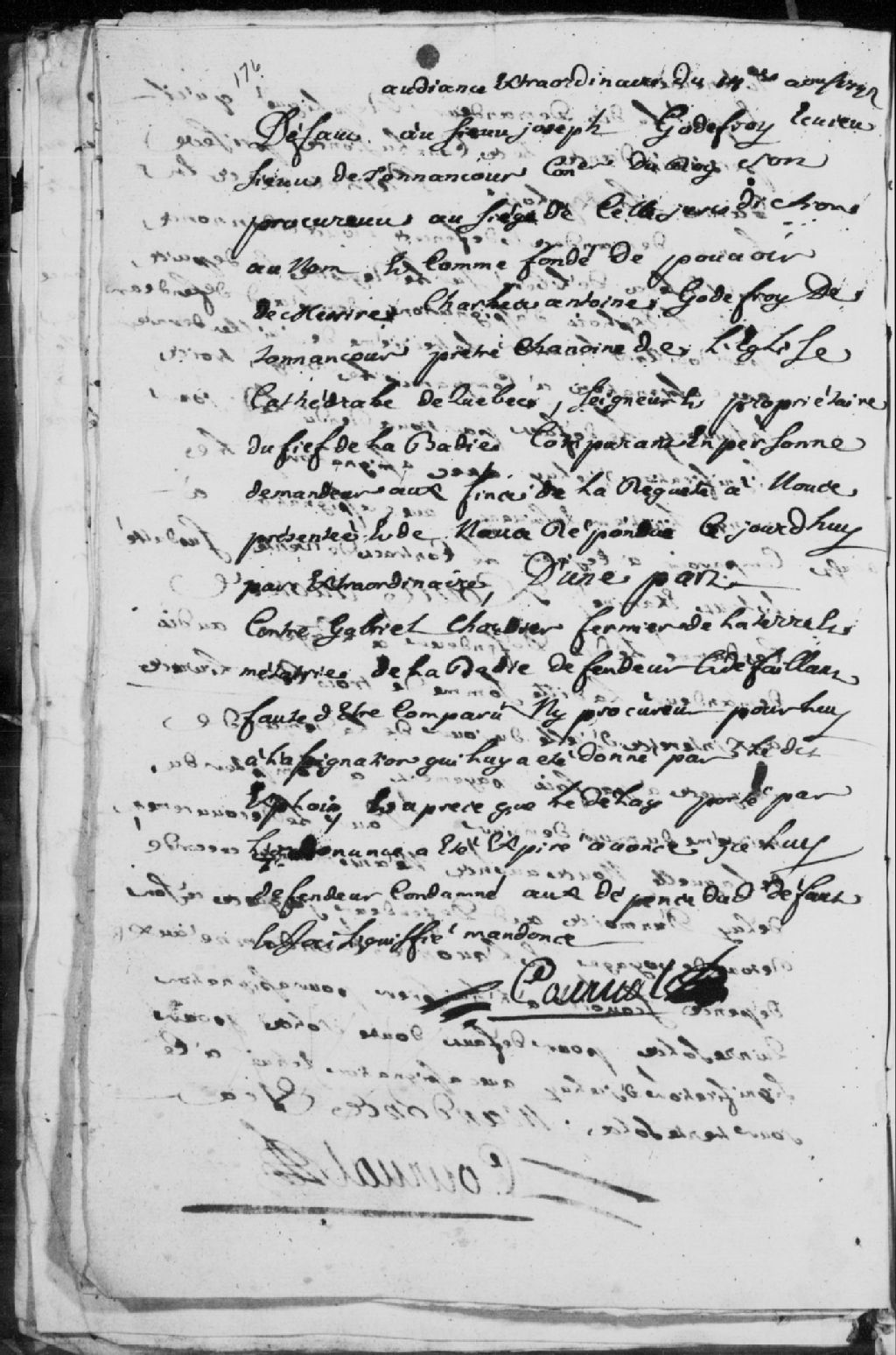Défaut accordé à Joseph Godefroy, procureur de Charles-Antoine Godefroy de Tonnancour, prêtre chanoine de l'église cathédrale de Québec, seigneur et propriétaire du fief de la Badie, demandeur, contre Gabriel Cloutier, défendeur et défaillant..., 14 août 1742, Archives nationales à Trois-Rivières, Fonds Juridiction royale des Trois-Rivières, (04T,TL3,S11,P3310).