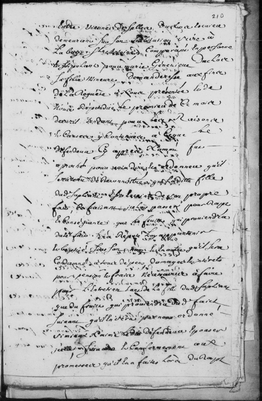 Le titre complet de la pièce se lit comme suit : Requête d'Étienne de Selles (Celles) dit Duclos, écuyer, demeurant à la Baie-Saint-Antoine, comparant par Marie-Geneviève Duclos, sa fille mineure, demanderesse, contre Jean Pépin, habitant dudit fief, défendeur, pour reconnaître que ladite fille du demandeur est enceinte et que le fruit de ce fait, sera réputé lui appartenir et être baptisé sous son nom et qu'il devra être condamné à payer les frais et dommages ou à marier ladite fille; le défendeur dit qu'il ne connaît pas intimement ladite fille; ordonné que les parties comparaîtront préalablement en personne pour être interrogées, dépens réservés, signé Gde Tonnancour.