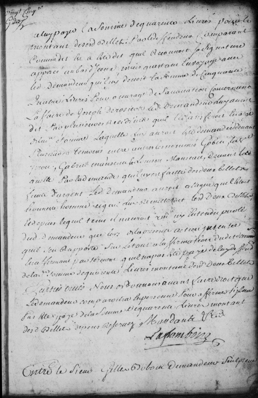 Le titre complet de la pièce se lit comme suit : Requête entre Gilles Bolvin, demandeur, sculpteur, contre Pierre Abraham Desmarets (Desmarais), habitant de la seigneurie et paroisse de Saint-François-Xavier-du-Lac-Saint-Pierre (Saint-François-du-Lac), défendeur, comparant par maître Olivier Pressé, notaire, demandant à ce que le défendeur reconnaisse sa signature au bas d'un billet contenant un arrêt de compte porté sur le livre du demandeur en date du 20 décembre 1742 ; il est ordonné que le défendeur comparaisse en personne à la huitaine pour reconnaître sa signature ou la nier, dépens réservés.