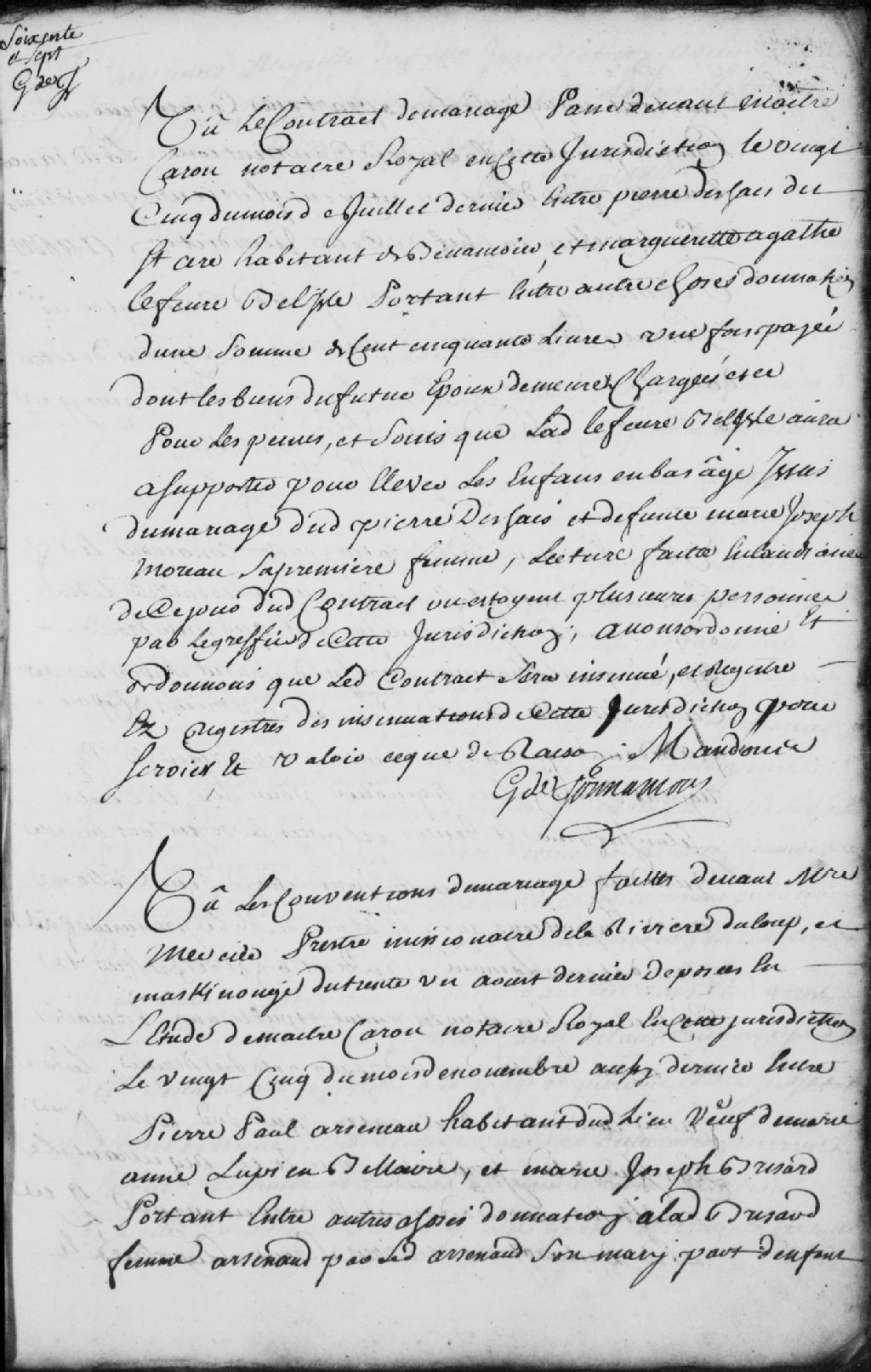 Contrat de mariage passé devant maître Mercier, prêtre missionnaire de la Rivière-du-Loup et Maskinongé, entre Pierre-Paul Arseneau (Arsenault), veuf de Marie-Anne Lupien Bellaire (Bélair), et Marie-Josèphe Brisard ; il est ordonné que lesdites conventions seront insinuées et enregistrées au registre, 1 décembre 1744, Archives nationales à Trois-Rivières, Fonds Juridiction royale des Trois-Rivières, (04T,TL3,S11,P3431).
