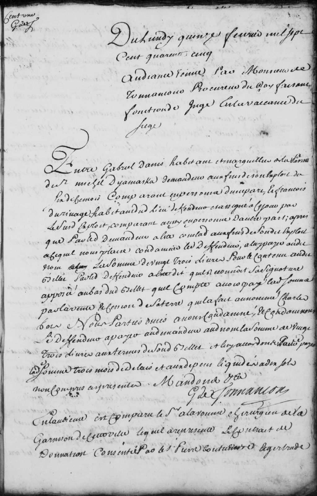 Requête entre Gabriel Danis, habitant et marguillier de la paroisse de Saint-Michel-de-Yamaska, demandeur, contre François Durivage, habitant dudit lieu, défendeur, pour la somme de 23 livres contenue dans un billet ; le défendeur est condamné à payer la somme de 23 livres, un délai de 3 mois lui est accordé pour le faire, dépens liquidés à 10 sols, 15 février 1745, Archives nationales à Trois-Rivières, Fonds Juridiction royale des Trois-Rivières, (04T,TL3,S11,P3470).