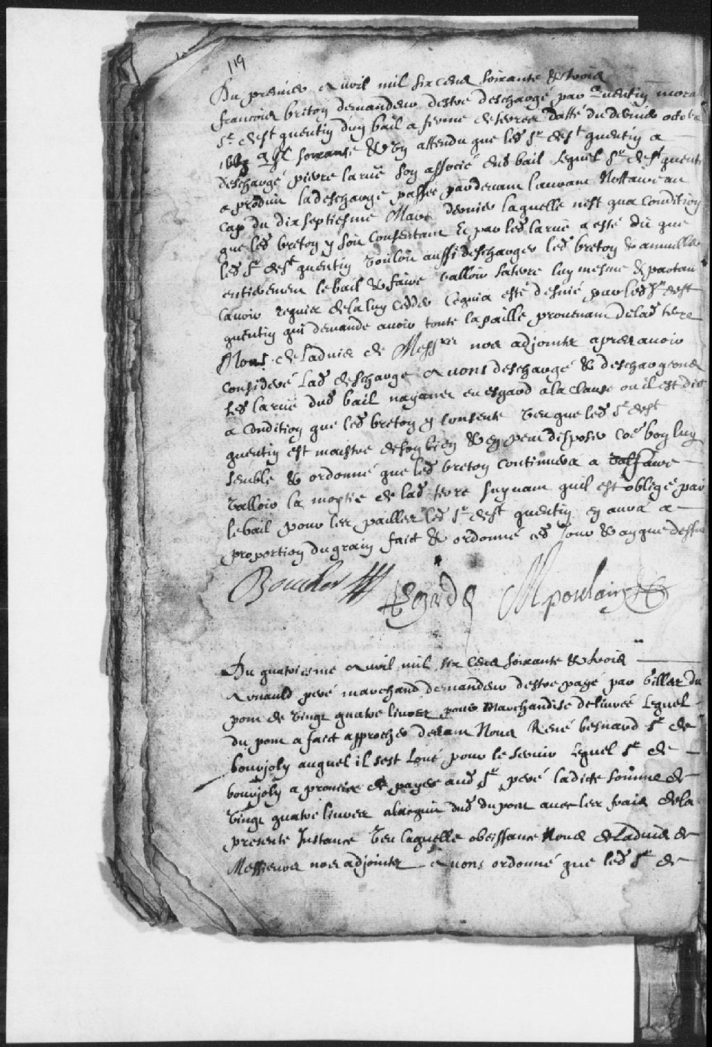 Le titre complet de la pièce se lit comme suit : Requête de François Breton, demandeur, contre Quentin Moral sieur de Saint-Quentin pour être déchargé d'un bail à ferme de terre daté du 31 octobre 1661 car son associé, Pierre la Rue (Larue), fut déchargé, devant le notaire du Cap-de-la-Madeleine (Louis Laurent sieur du Portail), par ledit sieur de Saint-Quentin de ce même bail. Ledit sieur de Saint-Quentin s'y oppose et réclame toute la paille provenant de ladite terre. Ordonné que ledit la Rue soit déchargé du bail et que ledit Breton continuera à faire valoir la moitié de ladite terre alors que ledit sieur de Saint-Quentin aura les pailles en proportion du grain fait.